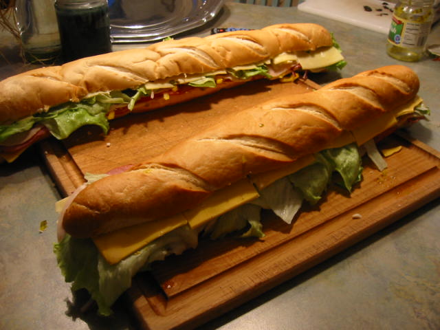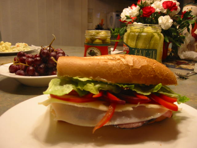 Typically, in response to my query, "what do you want for dinner tonight", L.D. simply answers: Pizza! Last night, however, quite surprised me. She suggested that we have "make your own sub sandwich night". Bully, I say. Splendid idea. Off I go to buy french bread, sliced turkey, ham and roast beef, pickles (Clausen Kosher Dill Spears), cheese, lettuce, tomatoes, and red onion. You may think, by golly that's nearly everything required to make sub sandwiches--didn't you have anything on hand. Well, we already had Miracle Whip, mustard and paper plates, so I was O.K. there. Anyway (and how dare you question the state of my pantry--ed) I also bought some cole slaw and potato salad to go with. It was great. All hail L.D.