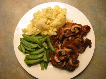 Now that I'm an athlete, I must eat like an athlete. That doesn't mean that I have to give up my fist love (Ribeyes). I just have to give up my second love (potatoes). So this lovely dinner is all meat and veggies. Ribeye smothered with mushrooms, sugar snap peas and cheesy cauliflower. Good enough to eat.