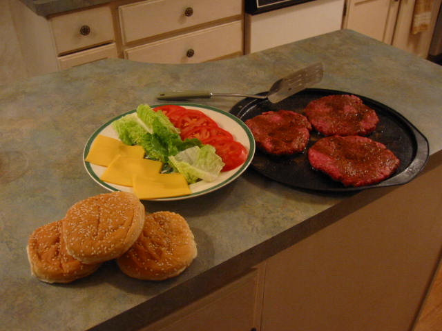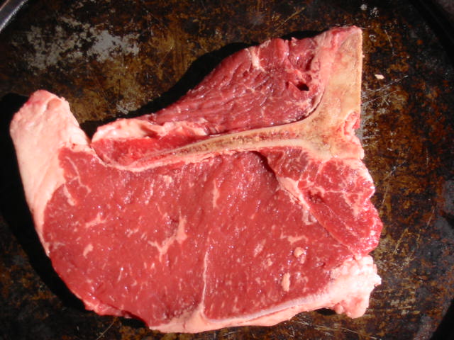 Lovely Wife, Lovely Daughter and BoyHead all went to Six Flags yesterday. So yes, I did get some exceptional hammock time in (beautiful weather with highs in the low 70's). But hey, this ain't the hammock page. Usually, when they go to Six Flags (they go often since they have season passes) it means that I am "on my own" for dinner. Since "Bambi" was not available, I decided to dine alone. Well, me and my 16 oz. T-Bone. Pictured left is the pristine lovely T-Bone. Of course, I decided to cook it on the grill. The grill was lit, heated, brushed, ready to go. I brought out the lovely T-Bone only to discover the grill had flamed out. Gosh, I wish those propane tanks had guages on them. I now am the proud owner of three yes three completely empty propane tanks. What a schmuck--Ed.. Thinking like a man, I immediately considered (1) loading the grill with firewood or (2) flaming the lovely T-Bone with the Butane Torch. I opted for the third option--broil that bad boy in the oven. No, it's not grilled. Yes, I do feel like a woman for broiling a lovely T-Bone. Yes, I am definitely a schmuck for having three yes three empty propane tanks. But I must say that it still turned out OK (See broiled Lovely T-Bone, upper right). Lovely T-Bone ended up medium, rather than my preferred rare to medium rare, but it was stil a successful meal. To the bottom right is pictured the final product, accompanied by a baked potatoe and some succulent homegrown no, not me--mine won't be ready til mid July tomatoes.