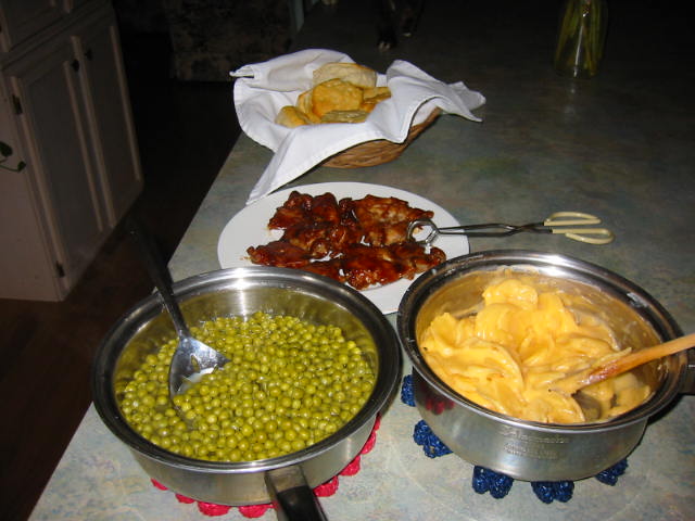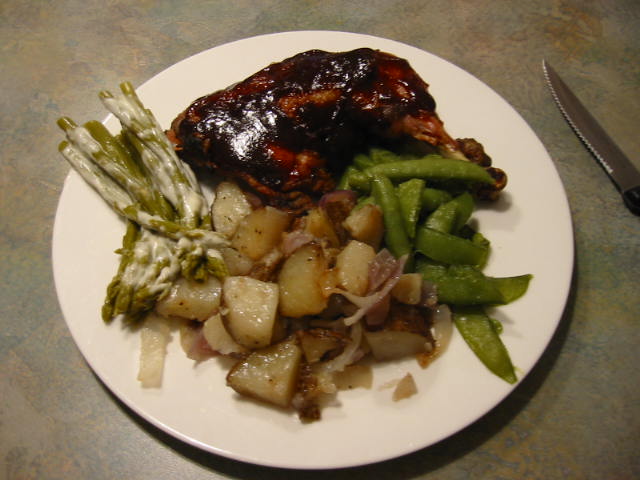Well, you knew it had to happen sooner or later. I've featured beef in various forms of dress. I've featured hearty sandwiches, cheese and crackers, tomatoes. I've even festooned this page with pictures of DragonBreath Salad. But, this is the first appearance of Chicken on this page. I haven't cooked very much lately, but last night I made a sumptuous meal for my family. Chicken--lots of it--roasted on the grill and smothered in BBQ sauce (KC Masterpiece, what else?). Sugar Peas with butter. Roasted potatoes with onions. Canned asparagus with Ranch dressing. For desert, I made a chocolate and peanut butter pie-like type of deal (hey, it came out of a box).