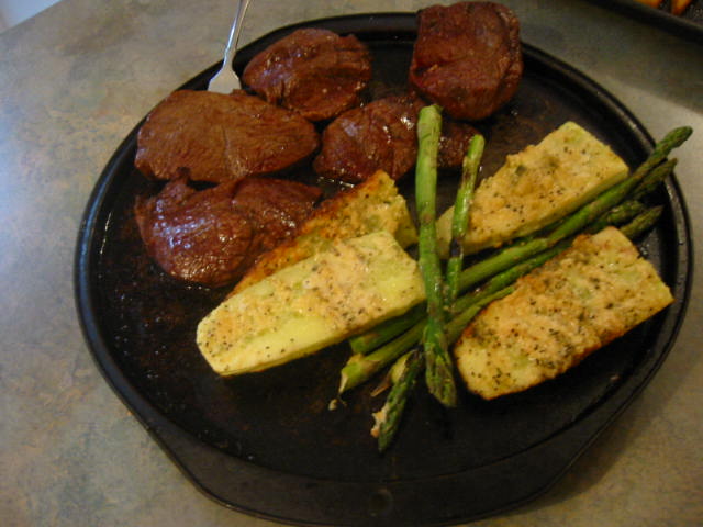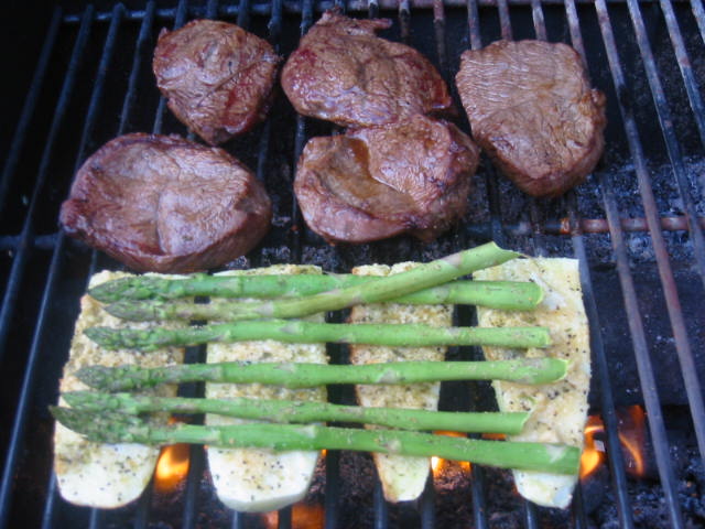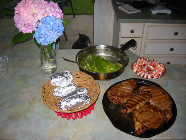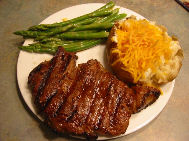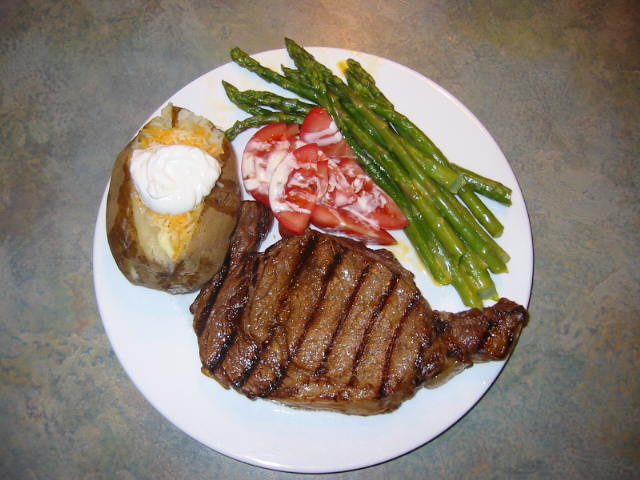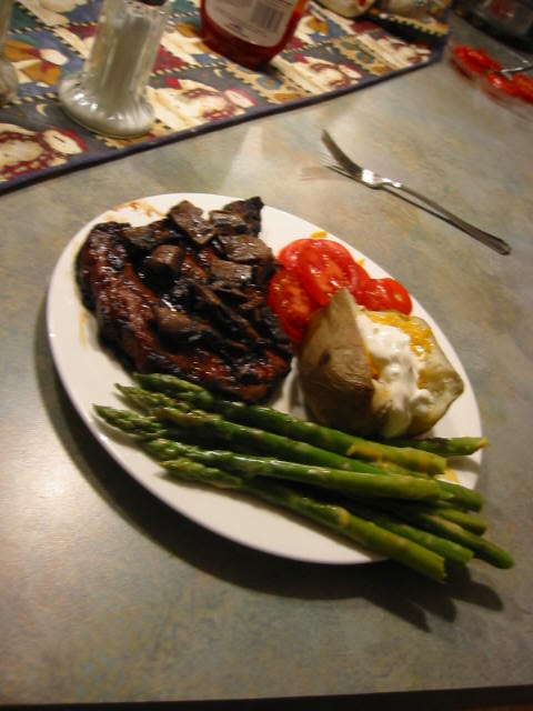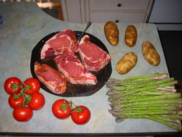 Enough of this snacktime business, it's time for some Real Food. Ingredients: Ribeyes, asparagus, tomatoes, potatoes. Simple. Directions: Cook 'em (except the tomatoes). Last and certainly not least: eat 'em.