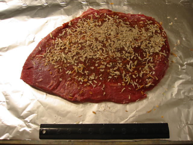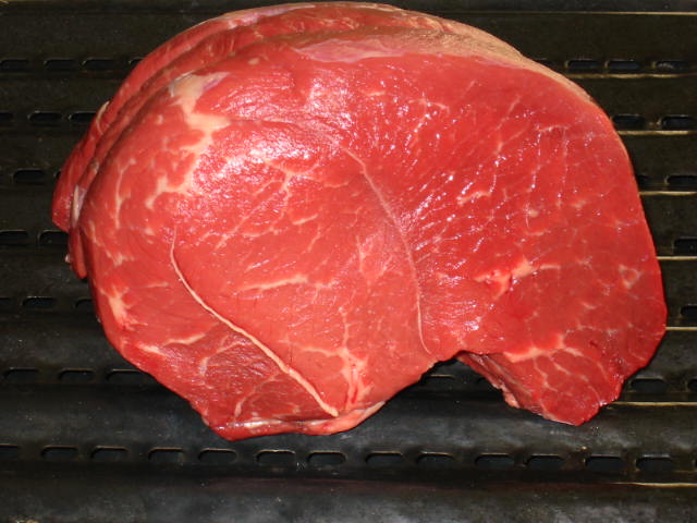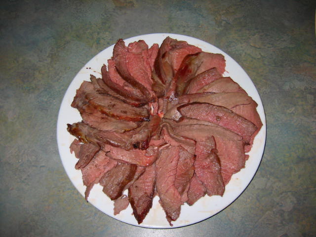 Oooohh baby! That's one sexy hunk of meat. A 4 pound top round roast. Lovely Wife is catering a wedding for 200 people in a couple of weeks and they requested "Steamship Round of Beef". This is basically a scaled down version (1/4 rounds run about 22 lbs.) So the local carnivores get to be the Guinea Pigs oink, oink as Lovely Wife determines how much heat from the depths of Hades to apply to that bad boy... uhmm girl. The home team is hoping for much trial and error. But it appears that this beast has been cooked to perfection. Oh, did I say oink!!