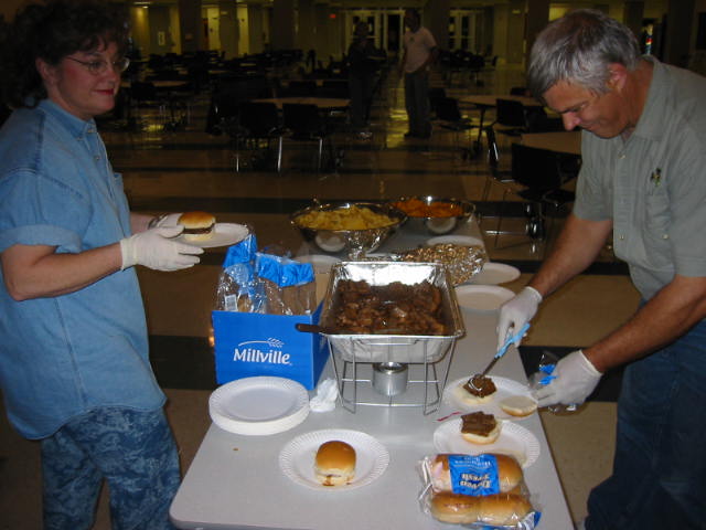 Lovely Wife (The Artiste) has been quite busy this week creating another masterpiece. That means it's up to me to take up the slack. Good thing my momma wife taught me right, 'cause I be knowin' how to cook. Pictured to the right is a wonderful onion flavored meatloaf (actually made two and froze one--how positively domestic), smooth mashed potatoes, gently steamed broccoli with a creamy cheese sauce and carrots in a honey mustard bath. Flaky dinner rolls and honey-butter were also served.
