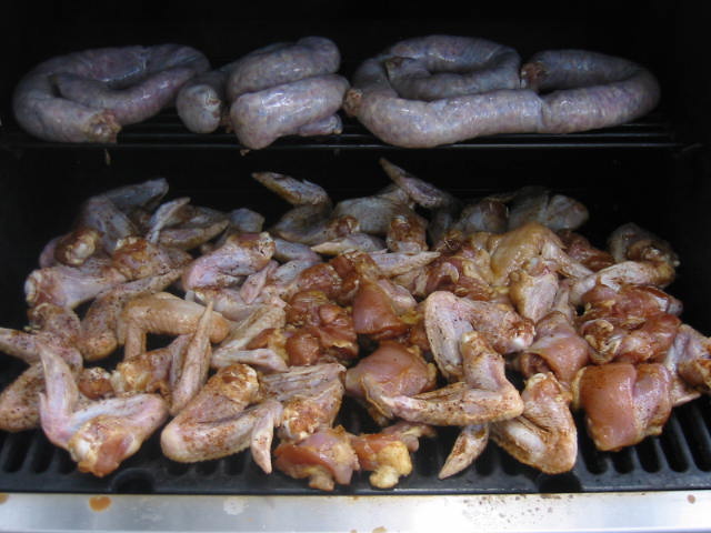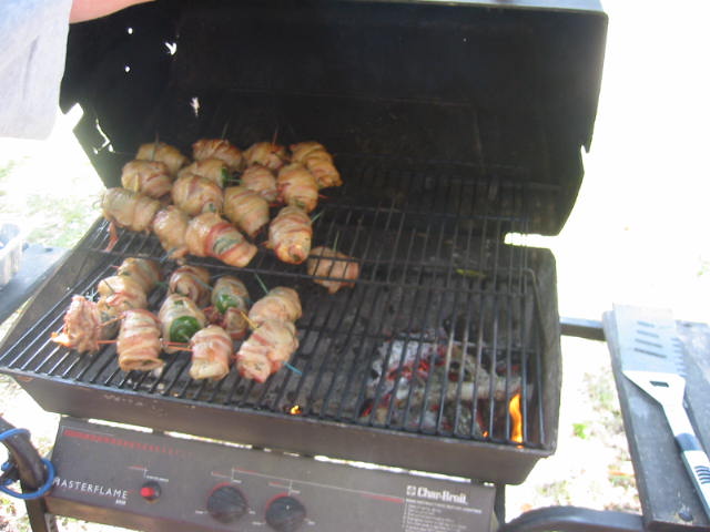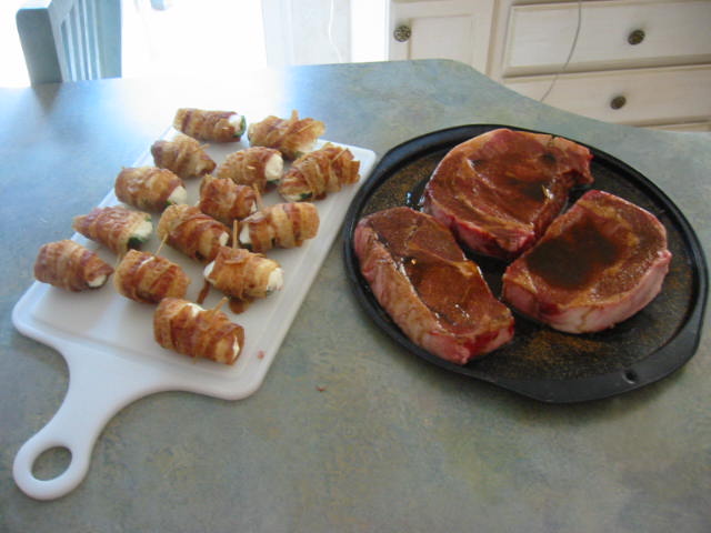 Today I decided to try my hand at Stuffed Jalapanos. I got the recipe at Daves Hacienda Weekend last year. I took extra care to insure that I had extracted all the seeds prior to stuffing them with Kielbasa and cream cheese and wrapping them with bacon. Half an hour on the grill and they were stupendous. Even L.W. liked them. Yeah, the Ribeyes weren't bad either.