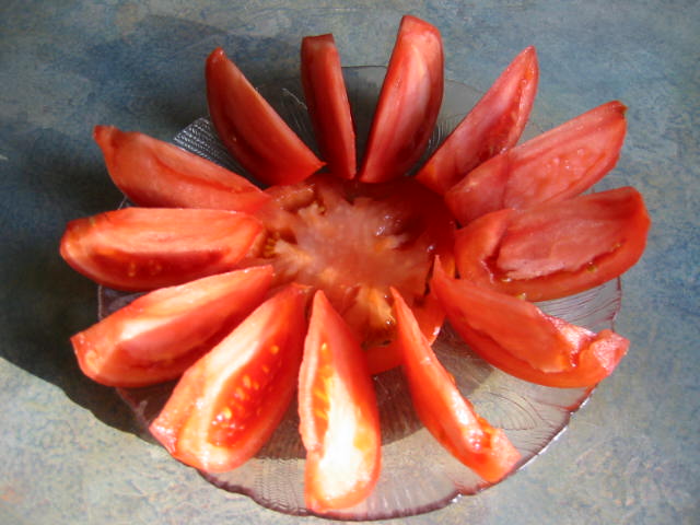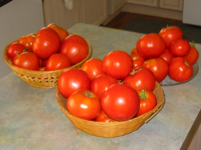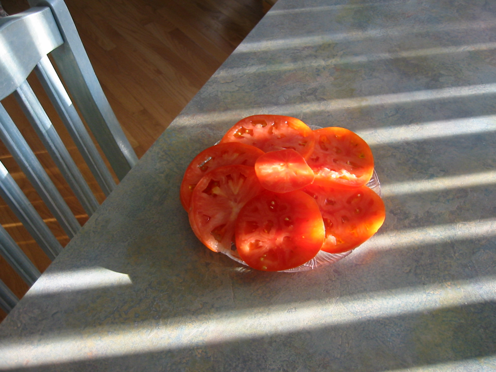 Remember way back when...oh, sometime in June. I was whining and complaining about the weather and the lack of good tomato weather. You know us farmers, we're always complaining about the weather. It had been cool and wet and they were running well behind schedule. Well, mama, the crop is in. I've been pulling about 5-7 per day off the vines. Since I'm only able to eat 2-3 per day, we're getting quite a backlog. I've moved beyond the simple "mater sammich" to the tomato salad. It's a lovely mouth-watering recipe. As many ripe, red tomatoes as you can stand (cut into wedges). Just a touch of lettuce (doesn't really matter what kind, it's simply a dressing delivery device), 23 degree (not 24, not 22--better use a compass) arcs of thinly sliced purple onions. To top it all off: a lovely red wine balsamic dressing. Truly one of the greatest joys of summer.