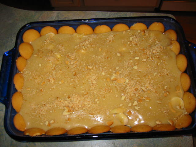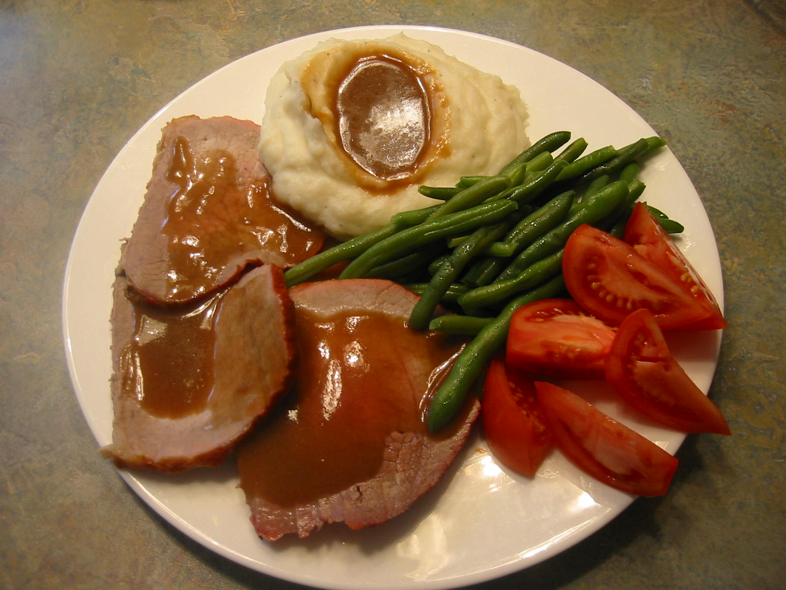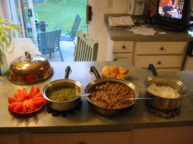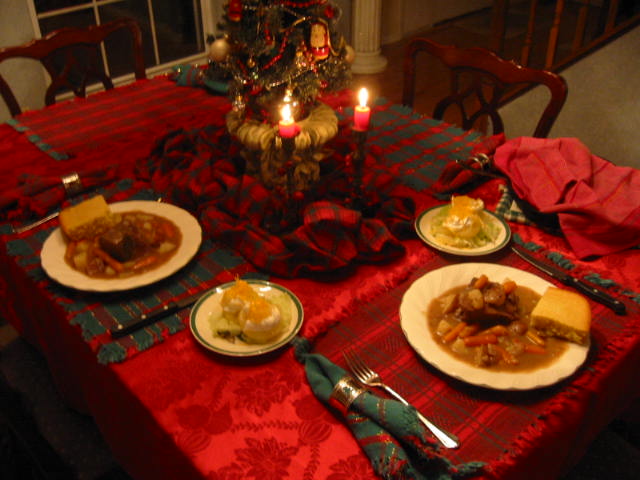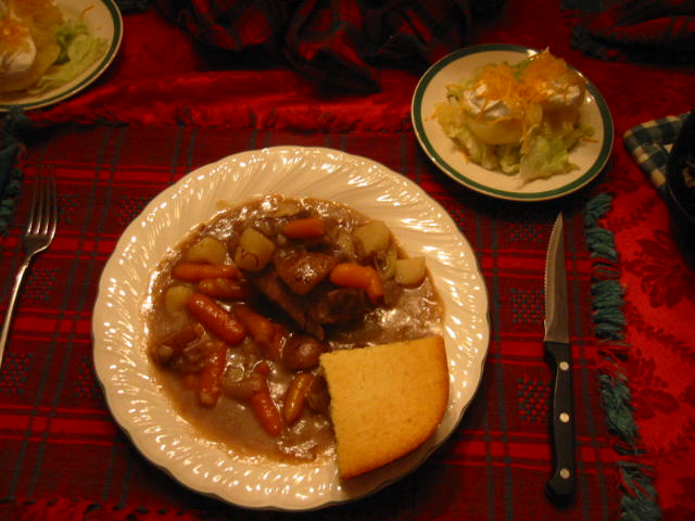 2005 starts out on a very good note with....beef! Yes, we have a lovely pot roast with carrots, potatoes, onions and gravy. No black-eyed peas, but who needs luck when you have faith. And cornbread. Hot, sweet cornbread. A little goes in the gravy and a little gets some butter and honey. To the side we have some pear halves with whipped cream and shredded cheese on a bed of lettuce. Alas, the youngsters are "out and about" so it's dinner for two. If you want to see the banana pudding we had for desert, go here