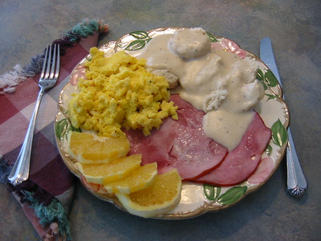 This is a quality, first-rate, grade A breakfast--the likes of which you'll never see at Denny's, IHOP or any other commercial eatery. This was concocted with pure love. Oh, and cheese eggs, bacon, hash browns, waffles, fruit and some fruit danish. Yummy!