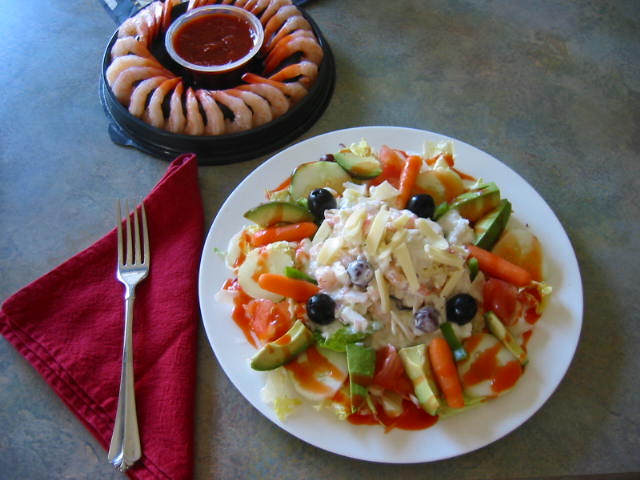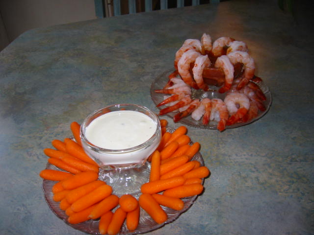 Lovely Wife put together a wonderful snack--just perfect for a Friday afternoon. First there was a tray of cheese, crackers and grapes (not pictured--I ate it too fast), next was shrimp cocktail and carrots with ranch dip, there was also deviled eggs. For desert (no, I didn't actually get that far) there was banana creme pie. The perfectly cooked, juicy and delicious roast beef to the right is from dinner yesterday--I just liked the picture. I'm a lucky guy.