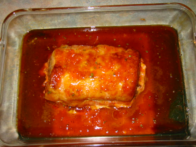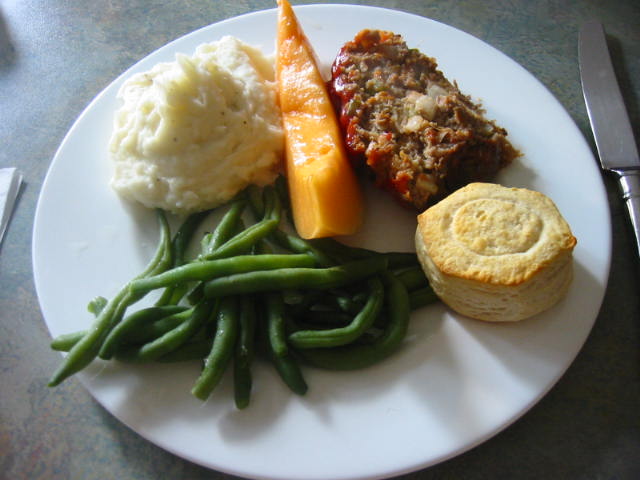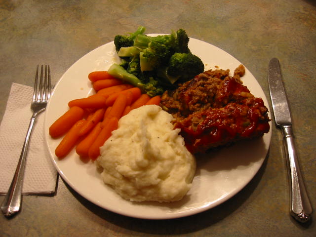 The other day, a friend of mine remarked, "have a great day and I hope your dinner makes your website." What a lovely thing to say. Well, this day my dinner did indeed make the site. It's not haute cuisine--that's for metrosexuals. It's just your basic home cookin'. This is the kind of food I was raised on. Meat, potatoes, vegetables and fruit. In the olden days when we had food pyramids (before that crazy Chet Atkins diet) this meal was considered well-balanced. No low-carb nonsense. Most of the low-carb craze is really aimed at codgers. Kids don't eat that crap, they eat burgers and fries and pizza and taco bell. Since we've had family meals since the kids werre young, they will eat dinners such as this. They'll eat fruit and vegetables. And everyone enjoys a nice meatloaf. But I do like the idea of a pyramid made of food.