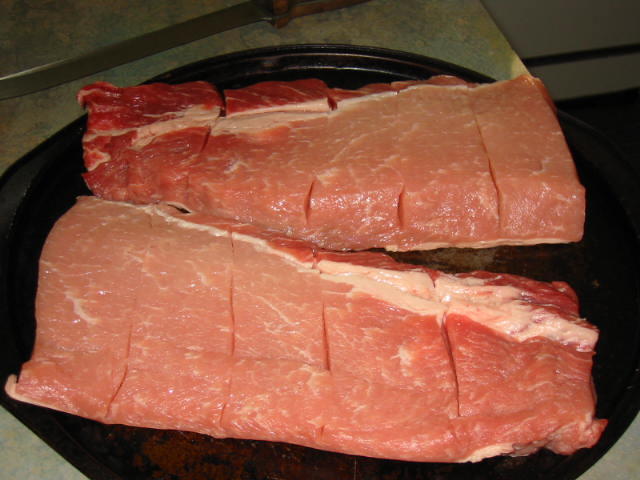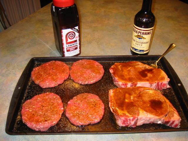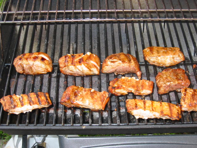 Delectable boneless pork ribs, marinated with a bit of Worchestershire Sauce and rubbed with some Lawrey's Seasoned Salt and roasted on the pit for about 10-15 minutes per side. The final touch is a thick layer of BBQ sauce--I heartily recommend KC Masterpiece. They are so moist and melt-in-your mouth, we call them "Pig Tenders". Enjoy!