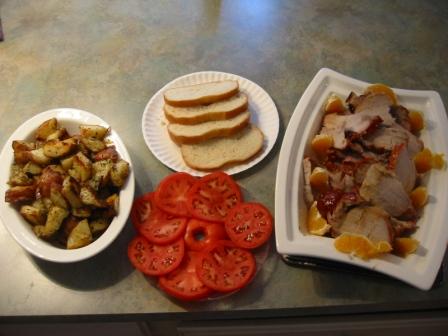 Tonight I took a little time and made a serious dinner. Orange glazed pork roast and herb and garlic roasted potatoes. The potatoes were amazing. I used fresh garlic and a harmonious assortment of chopped fresh herbs: parsley, sage, rosemary and thyme. Simon and Garfunkel would be proud. For good measure, I threw in a couple of cut vidalia onions. Even L.D. liked them--without ketchup.