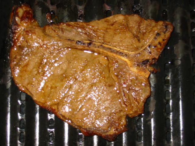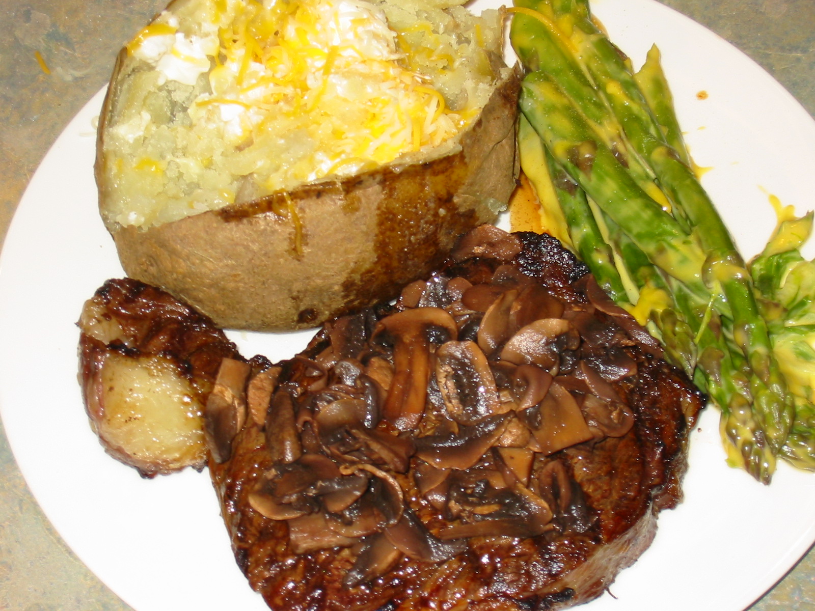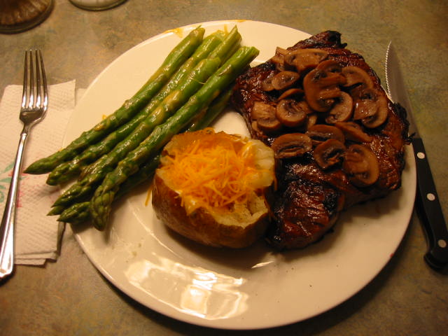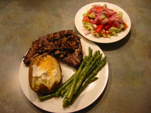 What to do, what to do.... Lovely Daughter and the BoyHead are out doing all their whatevertheydo's. L.W. is out creating more masterpieces. I've had a long day/week and I'm hungry. Hey Jethro, put on the feed bag! Time for vittles. But no possum and rabbit stew for this hombre. I prefer a slightly (just slightly) more sophisticated fare. Grilled T-bone steak (hey, the ribeye was $12.00/lb, so I has to settle) smothered in sauteed mushrooms, baked spud with fixins, asparagus with cheese sauce and dragon-breath salad.