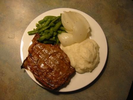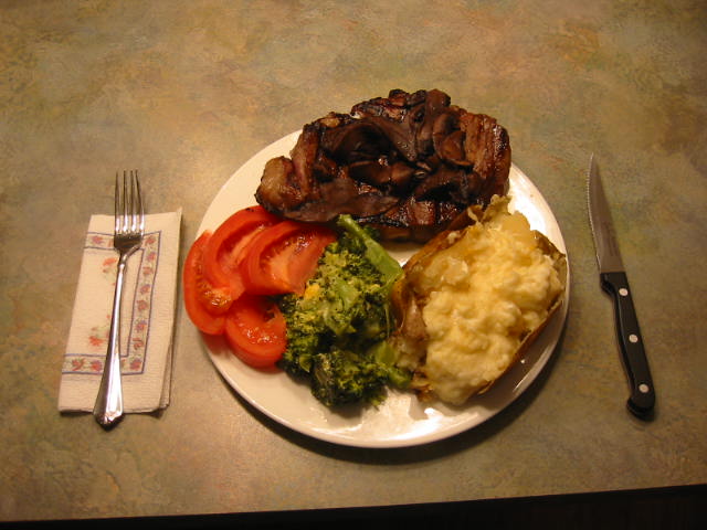 Man cannot survive on snacks alone. Finally, some real food. I've been eating fewer ribeyes lately, mainly because of the cost. Seems like last spring and early summer, I could get that fetching cut of beef for like $5.00/lb. Lately, I've seen it at twice that. Thin, dieter's cuts for $9.99/lb. I blame those Atkins people. Millions of Atkins dieters driving up the cost of my dinner!