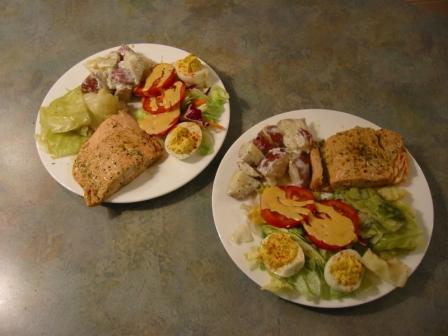 ...and today's offering is a lovely Salmon. I seem to be quite fond of pronouncing the "L". Not sure why. It does drive Lovely Daughter nuts--and yes, that's a silent "g" in daughter. Anyway, now that I'm an athlete, I've been eating better. Of course I still do the Ribeye, but I try to temper that with more fruits, veggies and fish. We've been eating salmon about once a week. We just poach it with a little oil (as Rachel Ray says, EVOO) and water and sprinkle it with "Citrus Grill Creations". I'm not sure what's in that stuff, but we just love on fish. In fact that's all we use it on. I tried to use it on beef one time and L.W. said, "tastes like fish". So, the lovely, edible salmon. No prep. Fast cooking (10 mins or so). Good eating.