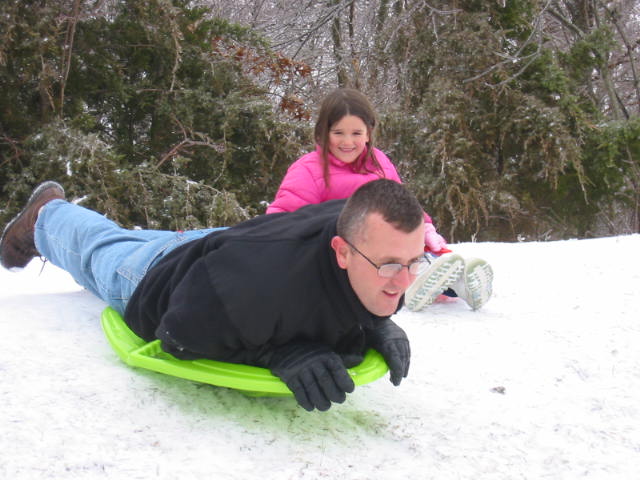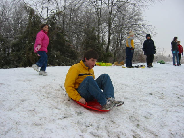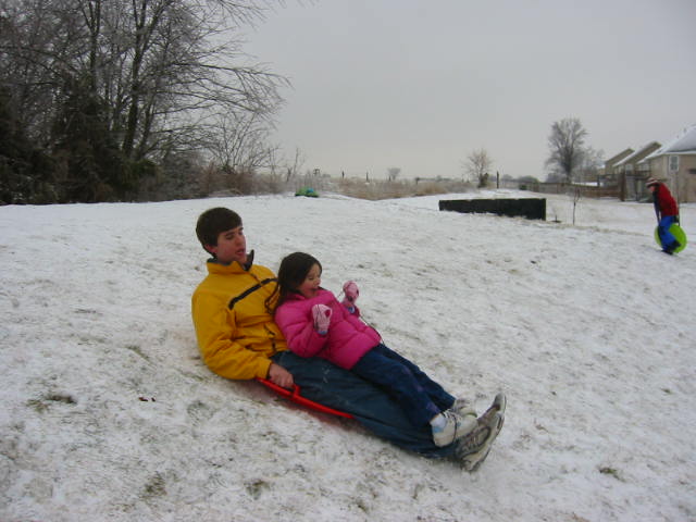 This weekend we visited the tribe of Sister Kim and Cap'n Nate. All their cherubs were present and we had a great time. Unfortunately, yours truly suffered from acute feline reactions, so Lovely Wife and I had to stay here. Yes, the K.C. area had a snow and ice (mostly ice) storm a few days prior, so we had the opportunity to go sledding. I got some good shots of Cousin Katie, Cap'n Nate and The BoyHead on "Dead Man's Hill".