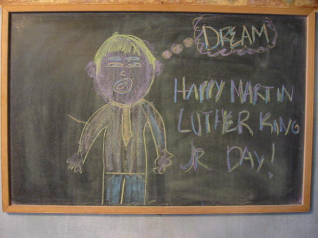 Saturday night I was relegated to the basement to watch the Rams Game (don't even ask me about it) and I finally noticed the chalk board. We put the chalk board on the wall to keep score in darts. Lovely Daughter had created a Christmas masterpiece. A decorated multi-colored tree and a Christmas message. Very nice. In between turn-overs and special teams disasters I could admire the chalk board. I thought, "I should take a picture and put it on the website". I was too late. Today I went to the basement and it was gone. In its place was this lovely tribute to "The Man with a Dream".