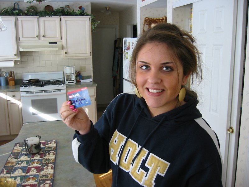 Not long ago, we upgraded Lovely Daughter's bank account from the young-punk-with-no-job account to the young-saver-and-tither-deluxe account. Best of all, the new account comes with an ATM/debit card. Up until now, L.D. could only get money as "cash back" when she deposited her paycheck. Now she's free to spend her money at will. I hope she chooses wisely, since she's saving for a car.