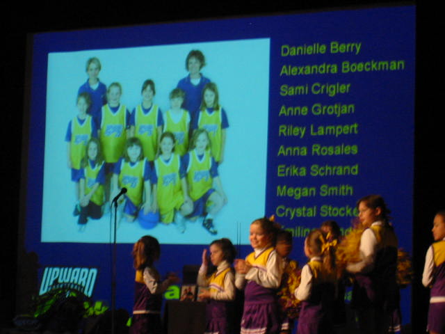 Today was the Award Ceremony for our Upward Basketball season. In case you didn't know, I co-coached a team this year. While it is a struggle at times to run a practice with 11 first and second grade boys, it was such a blessing to me. I saw these kids gain so much confidence and skill in just 10 weeks. It was really gratifying to know that I was a part of it all. If you've never heard of them before, Upward is a fantastic organization. It's all about learning skills, having fun and spreading the Gospel message. It's very well run and well organized. At the Award Ceremony, each team entered the stage through a wall of smoke and was cheered by the Upward Cheerleaders. The team picture with all the players names was shown on the big screen. Needless to say, a great time was had by all