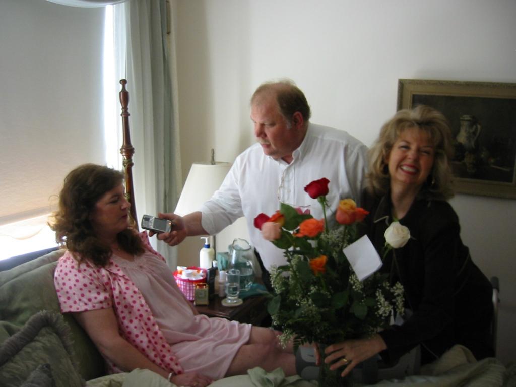 As you may know, Lovely Wife has had a pretty boring existence these past ten weeks. She's basically been laid up in bed for the past two and a half months. So today was something a little different. Our favorite radio station KFAV has a little bit called "Random Acts of Kindness". Today, they slammed a RAOK on L.W. by presenting her with flowers and doing a "Live Remote" from her bedroom. It was truly the highlight of her week.