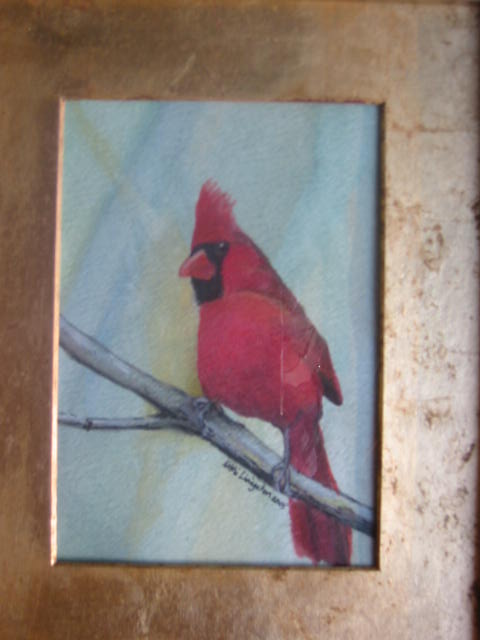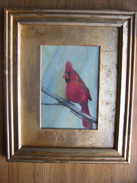 For many, today is a sad day. Tax Day. A day which stirs up anger and ire at the amount of money that the government confiscates from all of us. In our family, however, it is a day of celebration. Today is the birthday of my mother-in-law, the mother of my wife, the grandmother of our children, our beloved Marty. Many of the great qualities that my wife possesses, she acquired from Marty--not the least of which is her artistic abilities. For Marty's birthday, Lovely Wife created a masterpiece. Some might say, "she painted a picture of a bird". But it's much more than that. First, let's start with the frame. It started as a regular, ordinary, two-bit frame. Then, L.W. made it regal. She applied gold leaf and then antiqued it. The frame, by itself, is quite remarkable. Then there's the painting. The bird. But, not just an ordinary bird--a cardinal. You see, Marty and Wayne are avid birdwatchers and the cardinal is one of their favorite birds. This was truly a gift of love. When I remarked to someone that it was like a professional painting, they responded, "it is a professional painting". Bully!.