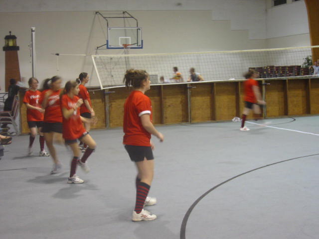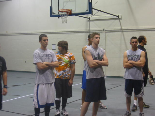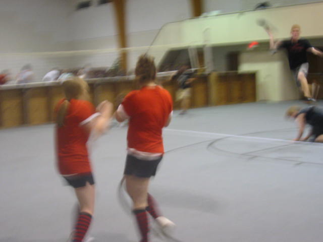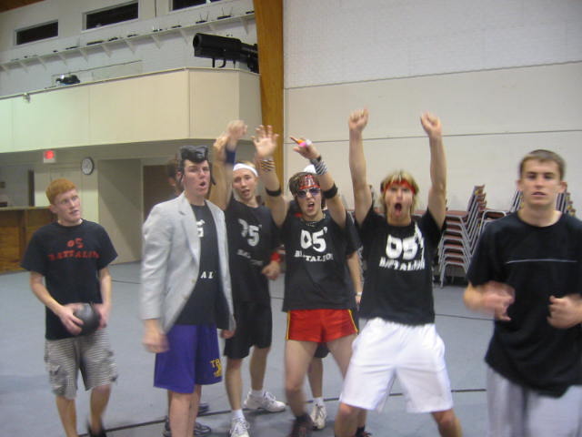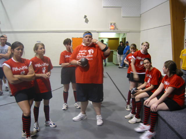 Today marked the second weekly meeting of combatants of the Dodgeball season. Our church sponsors the event which has taken on a life of its own. The first week, only Lovely Daughter's team (The Flaming Jalapanos, a.k.a Fish in a Barrel) had bothered to accessorize with matching shirts, shorts and socks. This week, it seemed that every team had matching shirts--many with humorous nicknames of the players. Needless to say, it was another slaughter. The F.J.'s were pitted against the '05 Battalion, a fierce warlike nemesis. Their theme was, "No Mercy". They even resorted to kamikaze tactics where one player would kneel on all fours at the line and the kamikaze would run and jump off his back into Jalapano territory. While in the air, the kamikaze would hurl the dodgeball at the opposition. Of course, the kamikaze would be out for going over the line, but usually one or more Jalapanos would also be hit. The Battalion were loyal to their fellow warriors, however, and would brave hostile fire to drag their wounded off the field of play. And there were some injuries. In another match, one of our own, Mr. Clark, had to be medically evacuated--I think he may have stepped on a mine. Needless to say, all the combatants are nursing their wounds and preparing, both physically and mentally, for next week's battle.