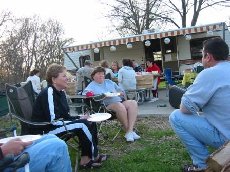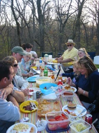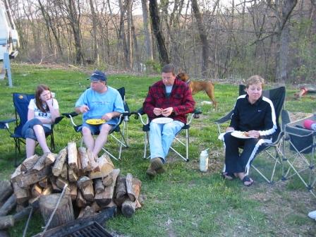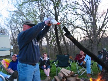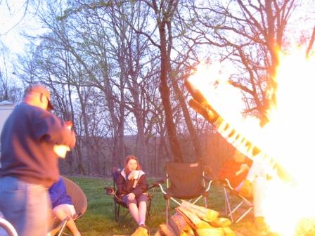 We weren't actually camping, but we know many people who were. They rounded up the RV's and parked them at Babler on one of the best weekends of the spring so far. L.W. and I went out on Friday evening to enjoy good food and good friends. And good meat. Actually, the only thing better than meat is meat outdoors. There was also good fire. Seems like there's always at least one pyromaniac in the crowd.