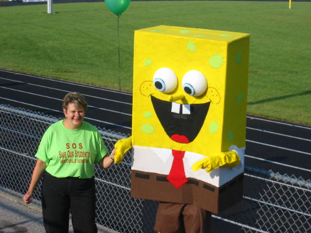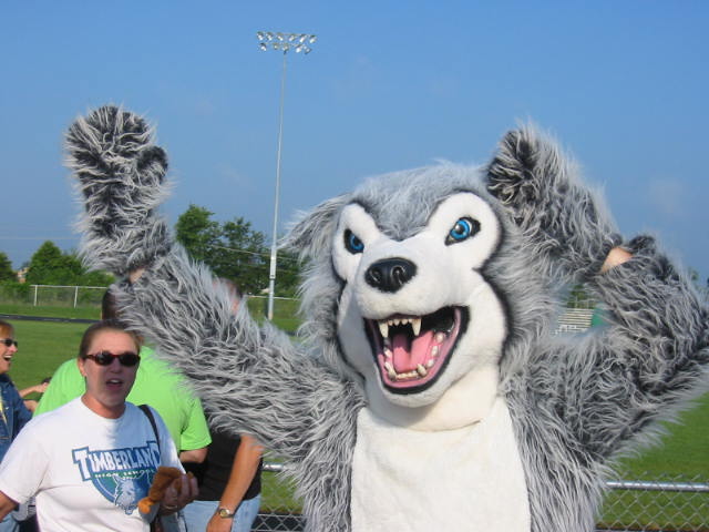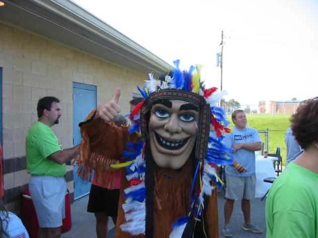 Last day of July. Whew! the summer is going fast. Still no tomatoes, but they're on the way. Lovely Daughter had her first cheerleading gig this morning. It was a rally for the tax levy we'll be voting on August 3rd. All the usual suspects were there. Big Scary Wolf, Sponge Bob and Crazy Injun who tried to hit me up for wampum.
