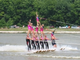 We had quite a robust Fourth this year even though it fell mid-week. The day began early with a 9am Ski Show. This is an annual event put on by the Show Me Skiers. The whole community is invited to attend and participate. Back in the day, both ManHead and Lovely Daughter were in it. This year's theme was Christmas in July. The M.C. even wore an Santa Claus suit. I did not envy him. There were the usual assortment of pyramids, barefooters, ski jumpers, wake boarders and nearly every kid in the community. I've come to realize that it's not quite as meaningful when my kids aren't in it--but I enjoy it nonetheless.