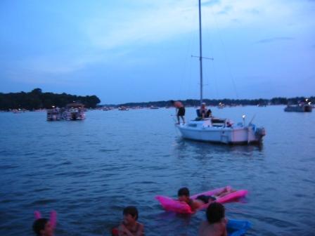 After a quick nap, we joined 2000 of our closest friends and we went out on our neighbors boat. Everyone who has a boat on our lake is out on the evening of the Fourth to watch the fireworks. You can practically walk across the water on boats. We lashed up with friends in a couple of other boats and enjoyed pyrotechnics and merriment.