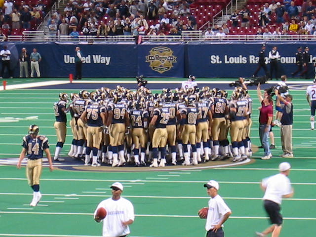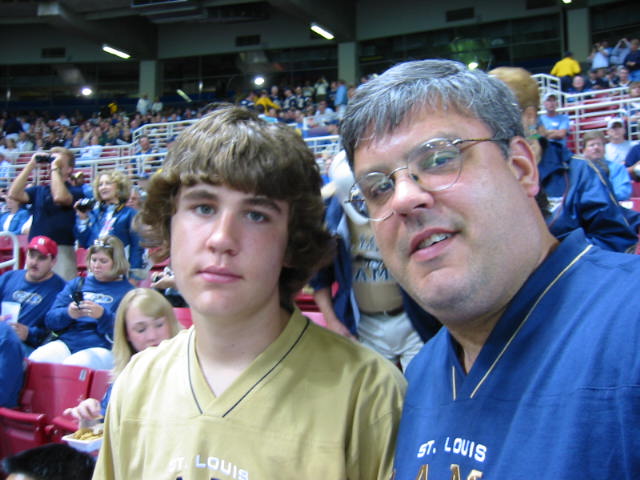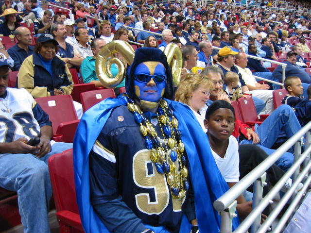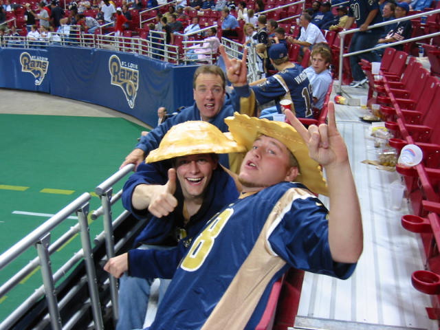 One great thing about the games are the masses of humanity. What a bunch of freaks. Some good looking women too. And freaks. Two guys in front of us have large multicolor afro wigs, painted faces and matching jerseys with "Short Bus" written on the back. Others are trying to start a new trend. Green Bay has its "CheeseHeads", but there are a few who are trying to start "RavioliHeads" here in Saint Louie. I don't think it will take hold, though. Scariest of all, though, is the dude on the right. Yeah, it's fun to see him at the game, but would you really want to know him in "real life"?