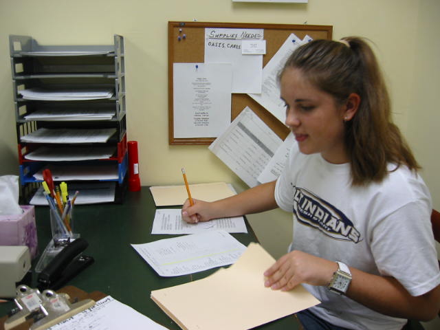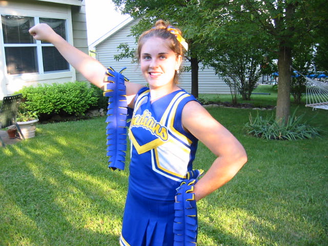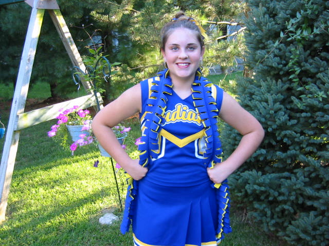 It's official! L.D.'s a cheerleader. Since the proposition for the tax levy passed, they will not be cutting out the freshman cheerleaders. Yeah, they're gonna teach math now too. And science. She just brought home her uniform today. Isn't she a doll. I'll be sure to take lots of pictures of her cheering at the games this fall. Go Indians!!!