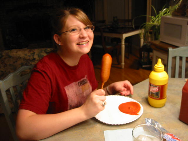 You wouldn't think a gal could go for 16 long years without a corn dog...would 'ya? Well, this girl has. Today, Lovely Daughter's Lovely Best Friend had her very first taste of the tubular meat product, encrusted with a sweet cornbread batter and then fried to perfection and presented on a stick. Known to us afficianados as "The Corn Dog". There are festivals devoted to this one-stick-wonder. There are