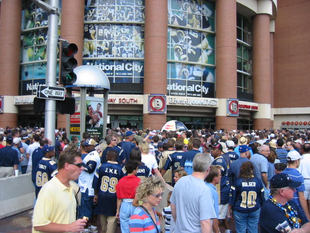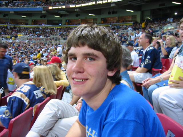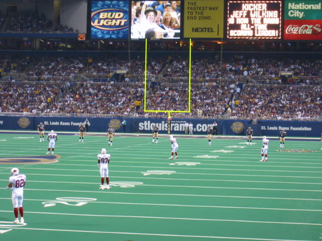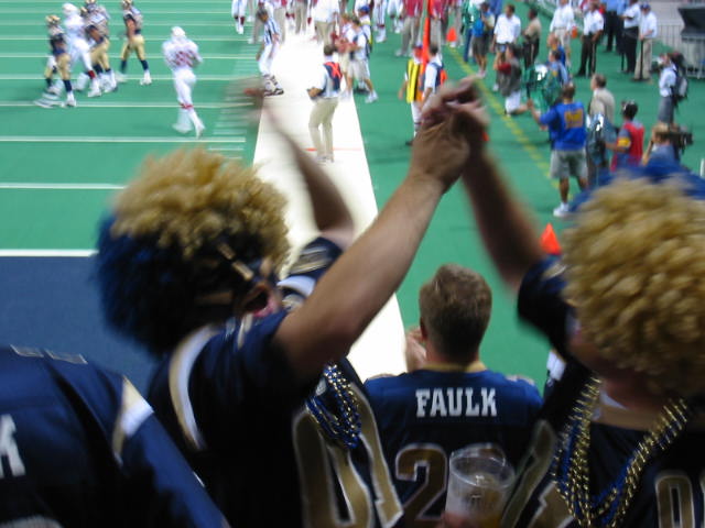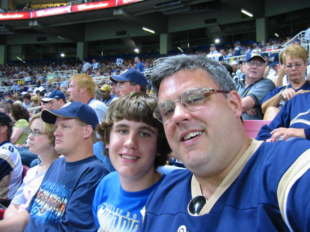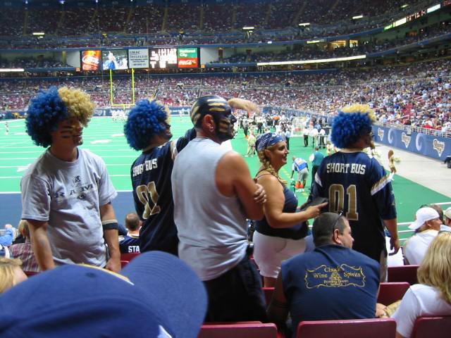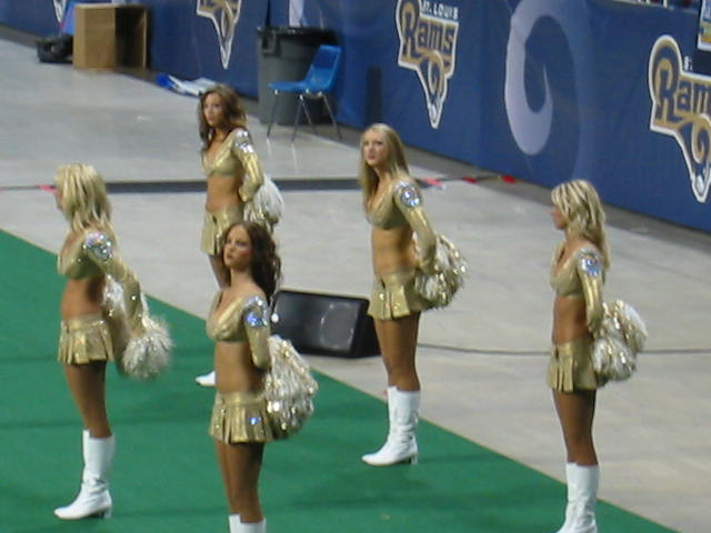 BoyHead and I went to see the mighty Saint Louis Rams defeat the hapless New Orleans Saint today. But, alas, our hopes were dashed. The Rammies had a rough day, but managed to be up by three points with 28 seconds remaining in the game. Unfortunately, the hapless ones were the Rams defense. The Saints slid down the field to come within field goal range and popped one in for three. The little ewes closed up shop early in the overtime period to lose by three points. One young chap sitting in front of us (obviously a student of the game) explained that Mike Martz isn't a head coach, he's an ass coach. That's the best line I heard that day. The only excitement during overtime was a little altercation amongst the brothers Short Bus sitting in front of us. It seems that they were giving unsolicited advice to the coaches and players during the overtime period. They were politely asked to pontificate elsewhere.