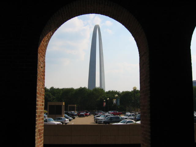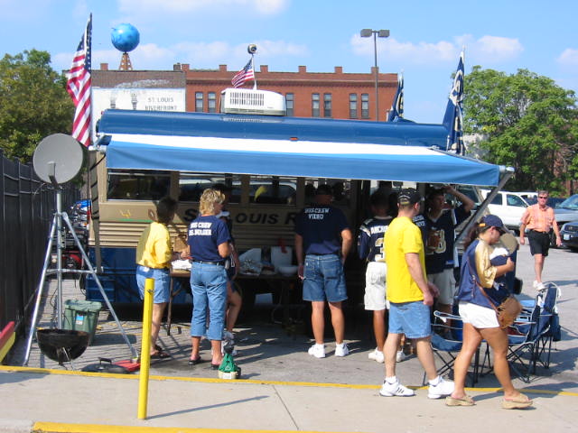 I took a couple pictures as we were leaving. The one on the left won the contest for the most dedicated tailgater. Look closely and you'll see that he as an air conditioned bus painted in Rams blue and gold. He's got a nice blue awning to keep out the sun. Looks like he's adequately stocked with the appropriate food/beverage combinations. He even has his portable satellite dish--just what every good tailgater needs. The picture on the right is just an "art shot". People tell me I have a good eye (it's the left one)