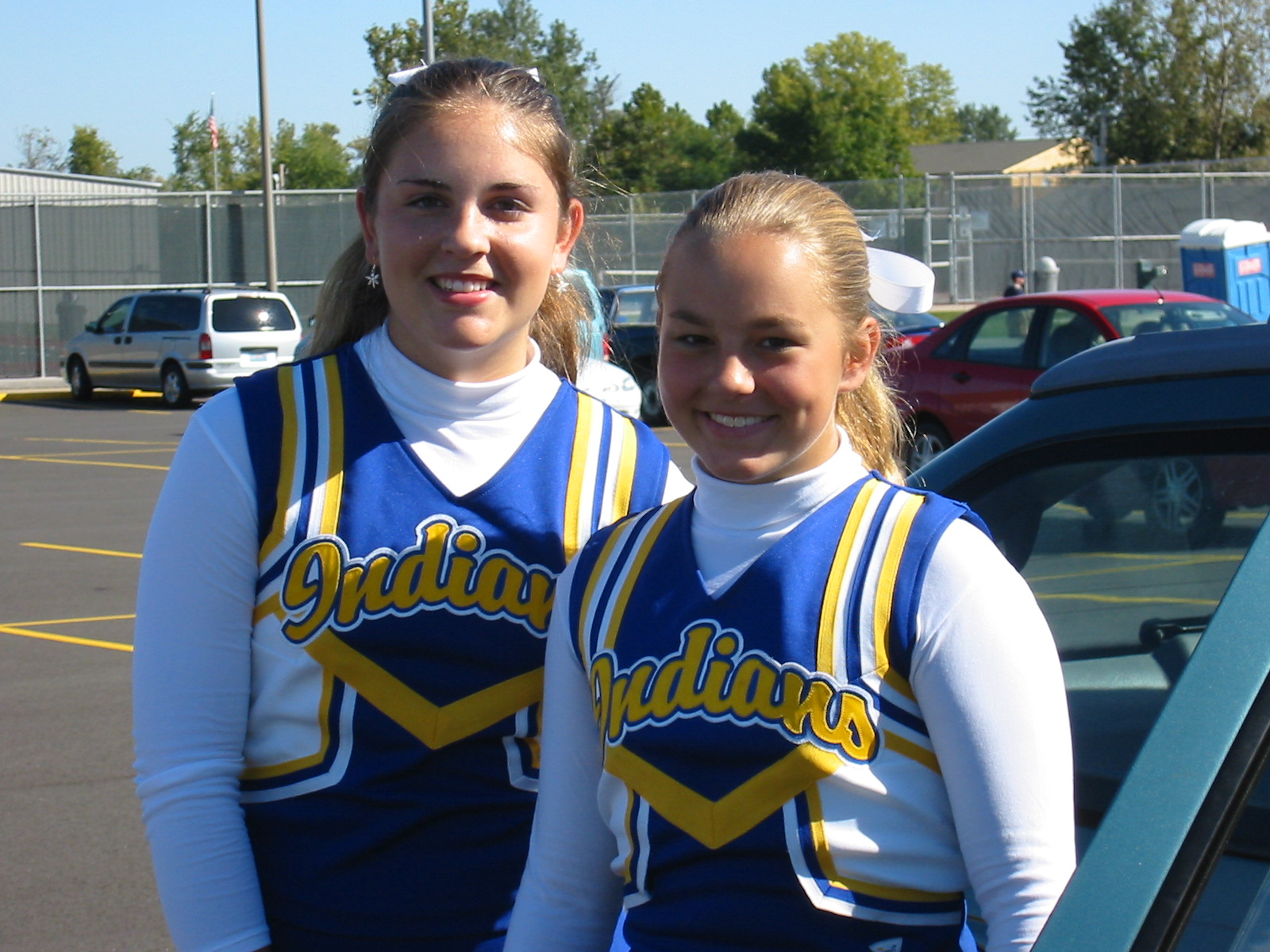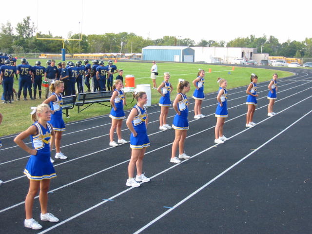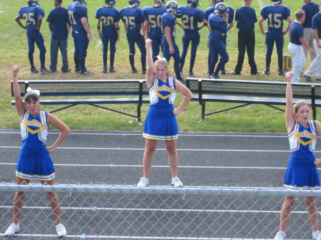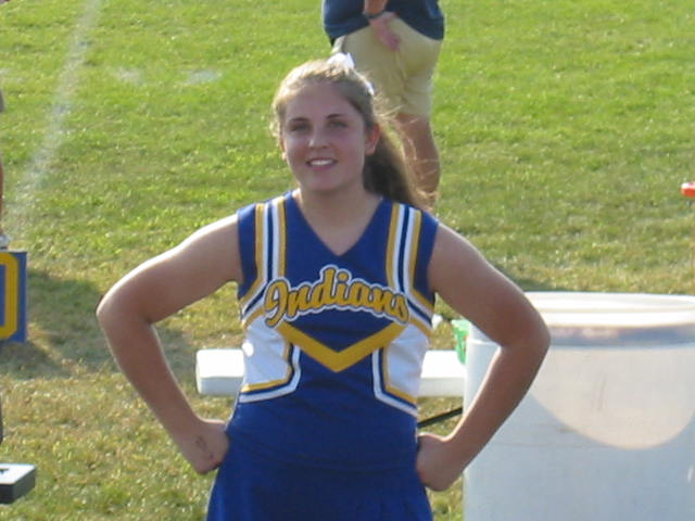 The High School football season has begun. Today the freshman High School Indians played the East Ipswich Slackjaws in a rousing game. It was 0-0 well into the third quarter when the Indians broke a run down the sideline....Wait a minute. It's not about football. It's about the cheerleaders. Today was Lovely Daughter's Cheerleading Debut. She got to wear her uniform to school and everything. Wuhoooo! I think I was as excited as she was.