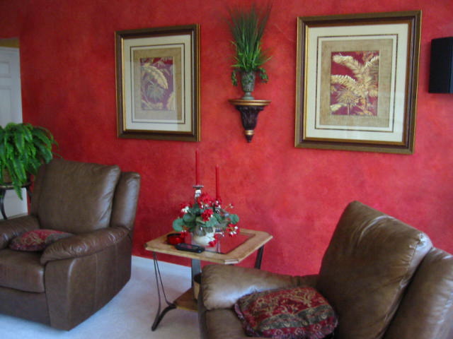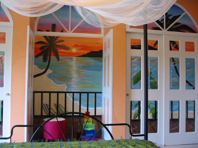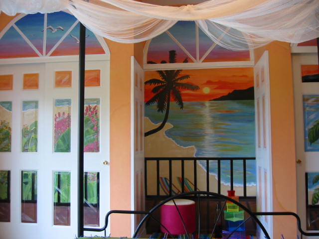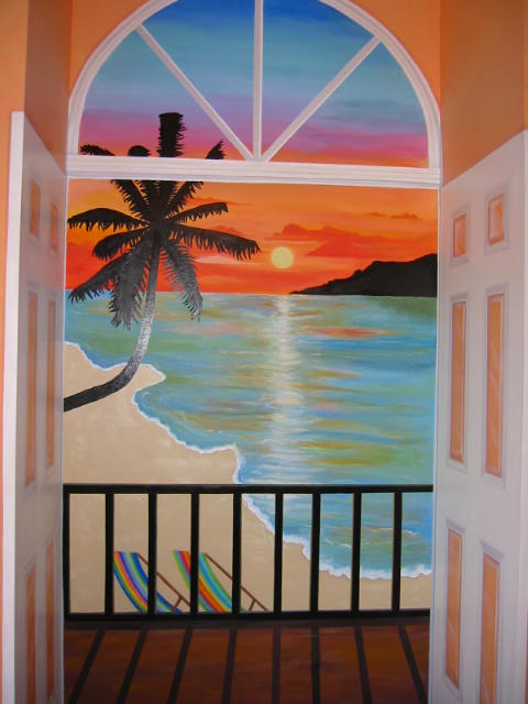 As I've mentioned before, Lovely Wife is indeed an Artiste. She has been busily slaving away creating a masterpiece mural. It's a tropical theme. A vision of a beautiful sunset off the balcony and visible through the adjacent windows. She created this on a wall with a small nook and the closet doors on each side. All the semi circles and the two open french doors on either side of the sunset are not real -- just painted on a blank wall. What a view!