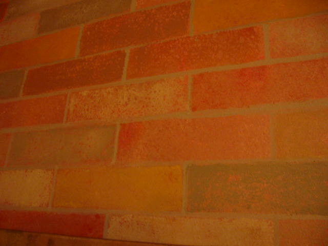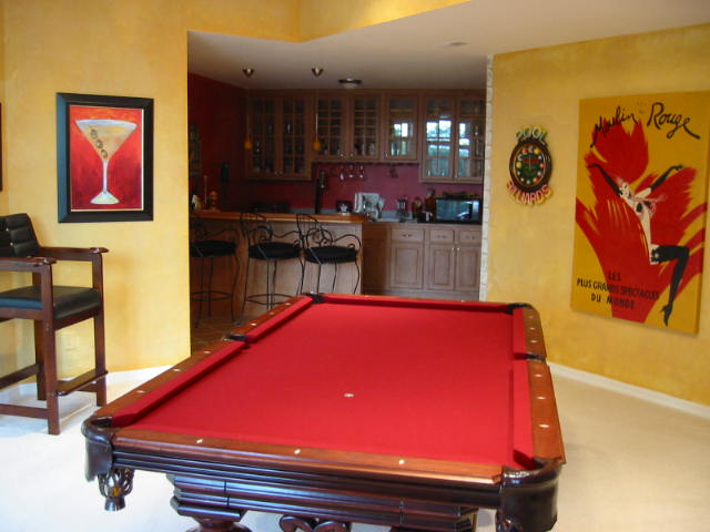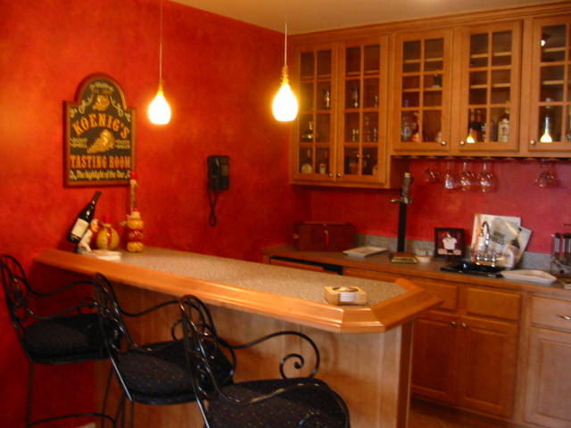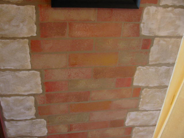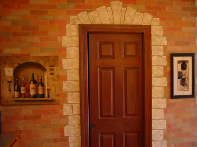 Those of you who have been checking the kitchen page (and how dare you not!) know that Lovely Wife has been quite busy of late. She's been faux painting the basement of a friend of hers. Since she's done such a splendid job, I thought I'd let you in on it. I particularly like the fake bricks and rocks. The pictures don't hardly do it justice. When you're there in the room it looks real.
