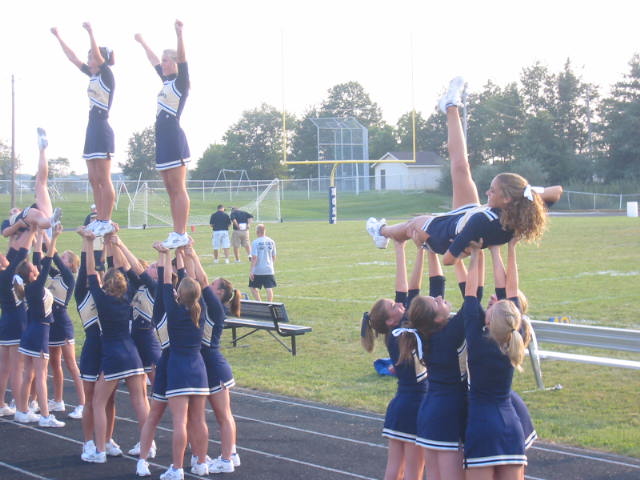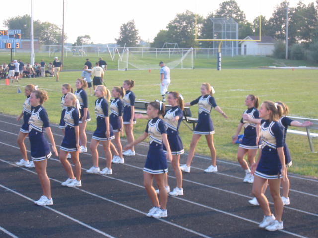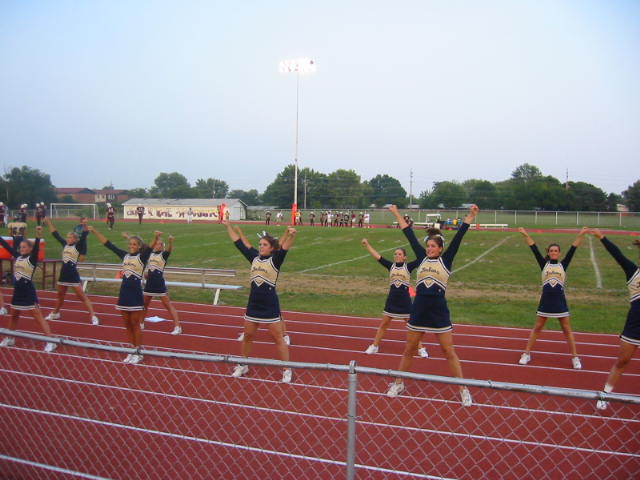 Yesterday was Lovely Daughters first outing of the year as a Sophomore Cheerleader. She's really worked hard this summer--the whole squad has--and it shows. Enough of me jabbering, already. Here are the pics.