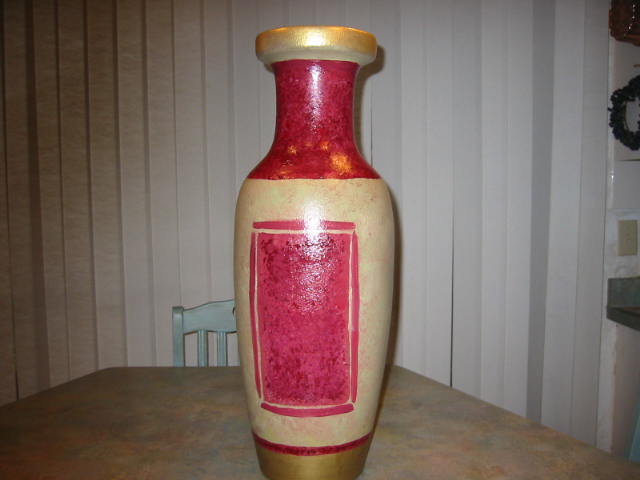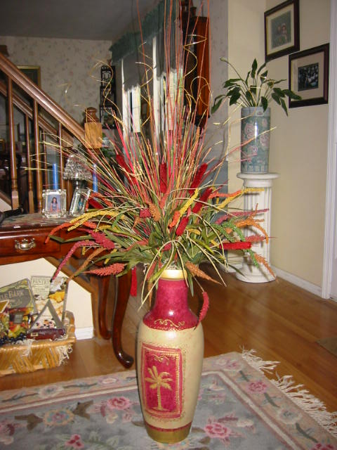 Lovely Wife has been quite busy "house sprucing". She's been tasked with decorating two homes that will be on the home tour later this month. Considering there are only five homes on the tour, those are pretty good stats. So, "what is a home sprucing?", you may ask. Well, it's taking all of your current stuff and maybe arranging it better, paint it a little, upholster it, perhaps, buy a few extra nick-nacks. Not a major overhaul, just "taking it up a notch". And notch it up she did. Pictured here is a vase in various stages of "notch-it-upedness". It began as a plain, solid vase that was on display. L.W. painted it, added some swirly-do's and designs and then put an arrangement of dead stuff in it. Fabulous. And this is what she did throughout two houses.
