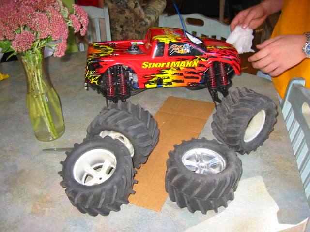 Today's the day that we've all been waiting for: BoyHead's Birthday. I picked the Boy up from school today so we could race to the License office and get his learner's permit. Mission: Impossible. I'll give you all the gory details another time. BoyHead enjoyed opening all his gifts (thank you for the gifts and cards everyone--BoyHead). Mostly he got accessories for his new Radio Controlled Traxxas SportMax. It won't arrive for a few days yet as we let BoyHead buy it on eBay. We gave him his max bid and allowed him to spend it on the car of his choice. I was actually impressed with all the research he had done. He knew what he wanted and why--he also knew what the correct price should be. It's a really cool car (really, it's more like a Monster Truck). Goes like 40mph.