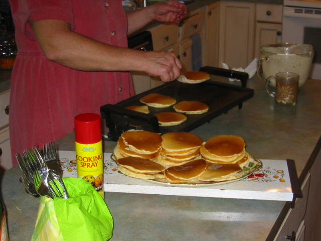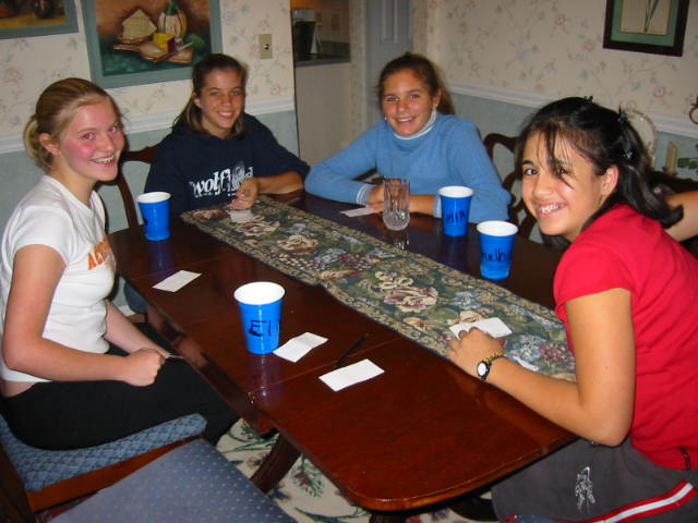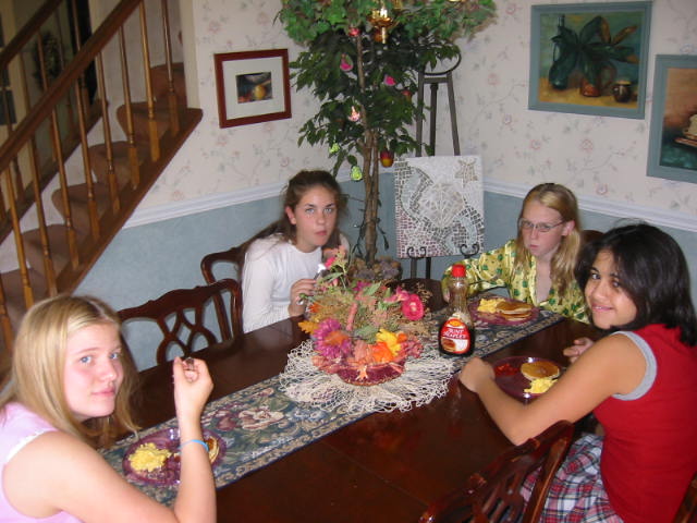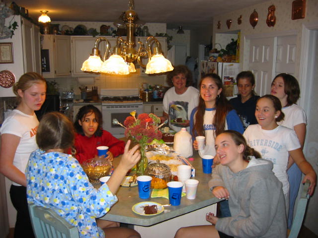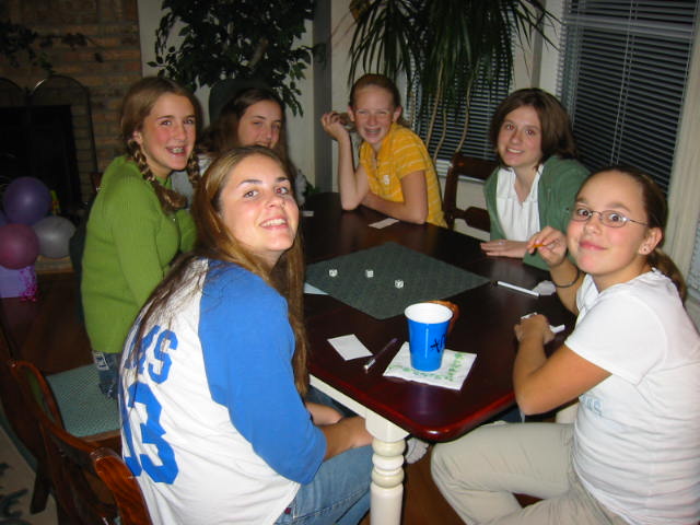 By this time it was 11:30 p.m. L.D. got lots of girly stuff--smelly stuff, clothes, hair stuff. Tough for me to judge, but L.D. really liked it. After Cake and Ice Cream it was round 2 of Bunko. Those girls took to Bunko like, well, girls to Bunko. Anyway, at this point I made my (sneaky, quiet) exit. I figured, hey it's 12:30. I've done my part. Also, I had to get up early the next morning to make BREAKFAST. No, not just breakfast, but BREAKFAST. The menu: Cheese eggs, pancakes, sausage, hash browns, cantaloupe, coffee, milk, O.J. Man, teenagers can EAT! After breakfast was the countdown to 10:00 a.m. Tick..........tock...........tick..........tock. Ohhhhh nooo, tiiimmme hhhaaasss nneeaarrrlllyy sssttoooppppeedddd. Ding, dong. Hallelujiah. A great time was had by all.