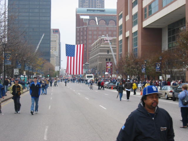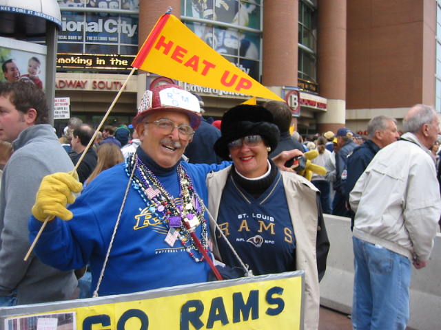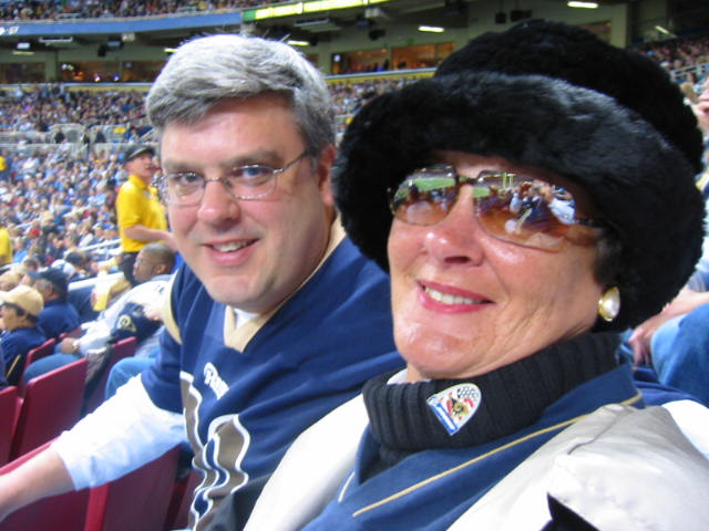 Thanks to our corporate sponsor, The Boo and I were able to go see the Rams play Arizona today. Actually, play might be a bit of an overstatement, but the Rams certainly did attend. We took the MetroLink TM downtown and had a splendid time. The sights and sounds of downtown--I just love it. Brats on the grill, live bands, crazies in the street. We got the required picture of The Boo with Mr. Saint Louis and he even asked me to take a picture with his camera. The Rams may have dashed any hope of getting to the playoffs today, but a good time was certainly had by all.
