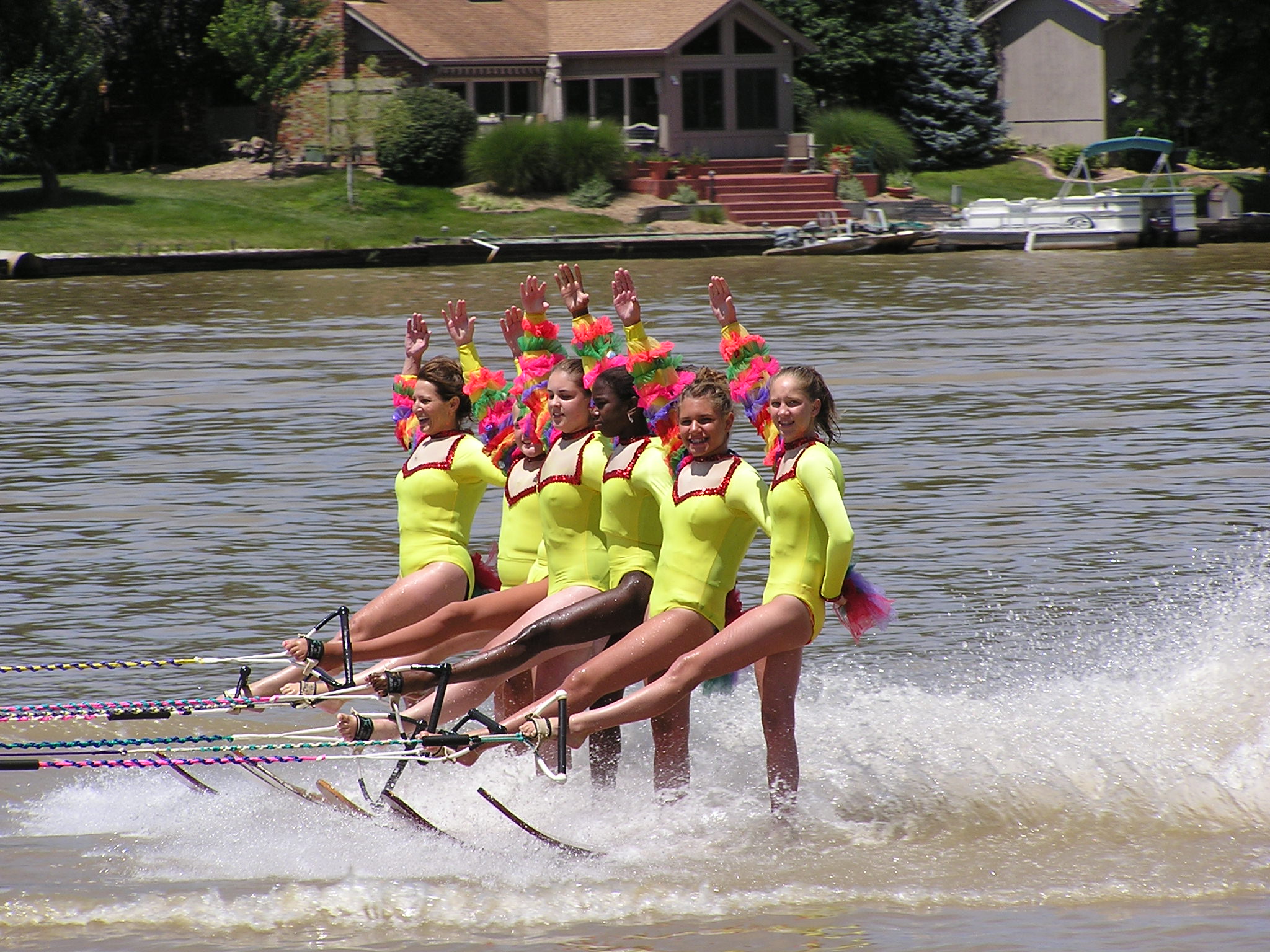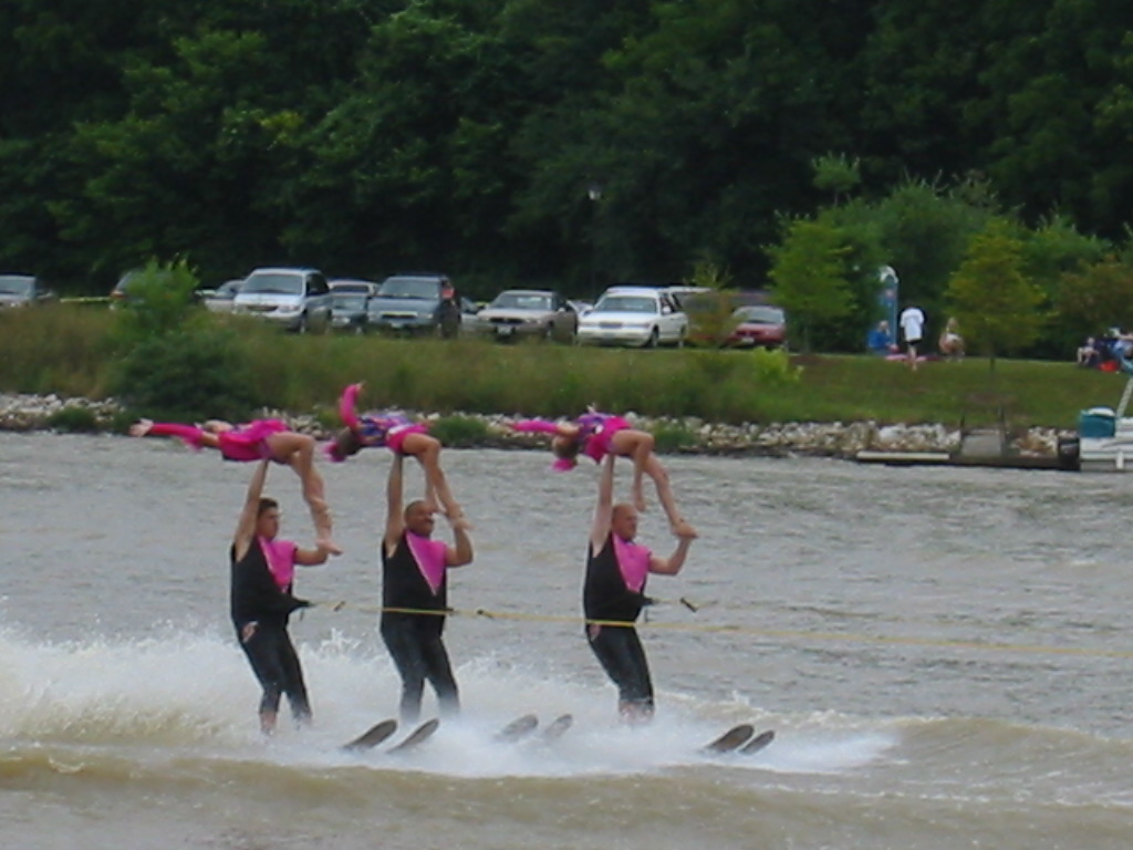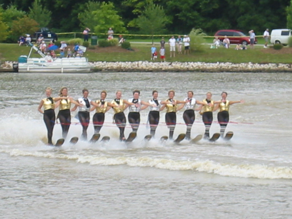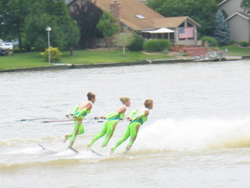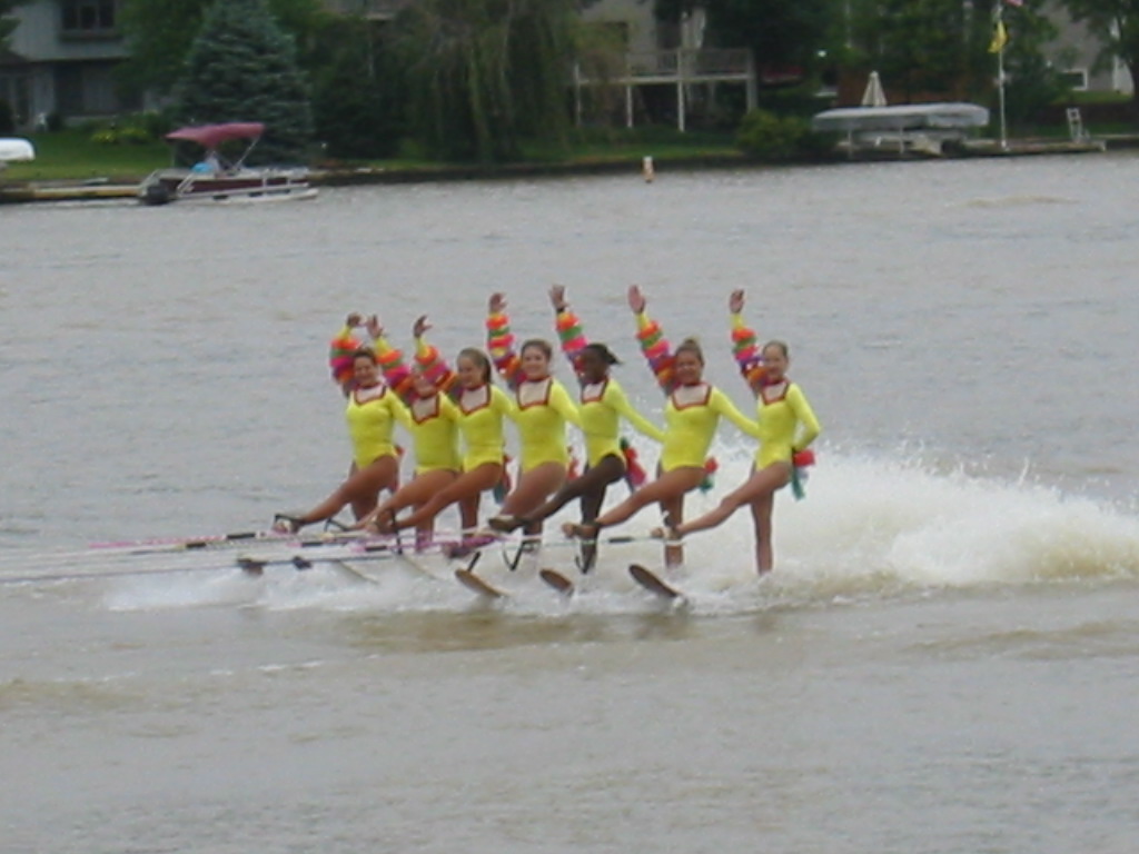 The entire show lasts over two hours and features everything from the very beginners to old codgers. There are wakeboarders, barefooters, ski jumpers, pyramids--the whole gamut. Come next year and see for yourself. There are some more pictures of LD and her line here , here , here , here , and here. They're all about 600 to 700 kb, so I hope you have a fast connection.