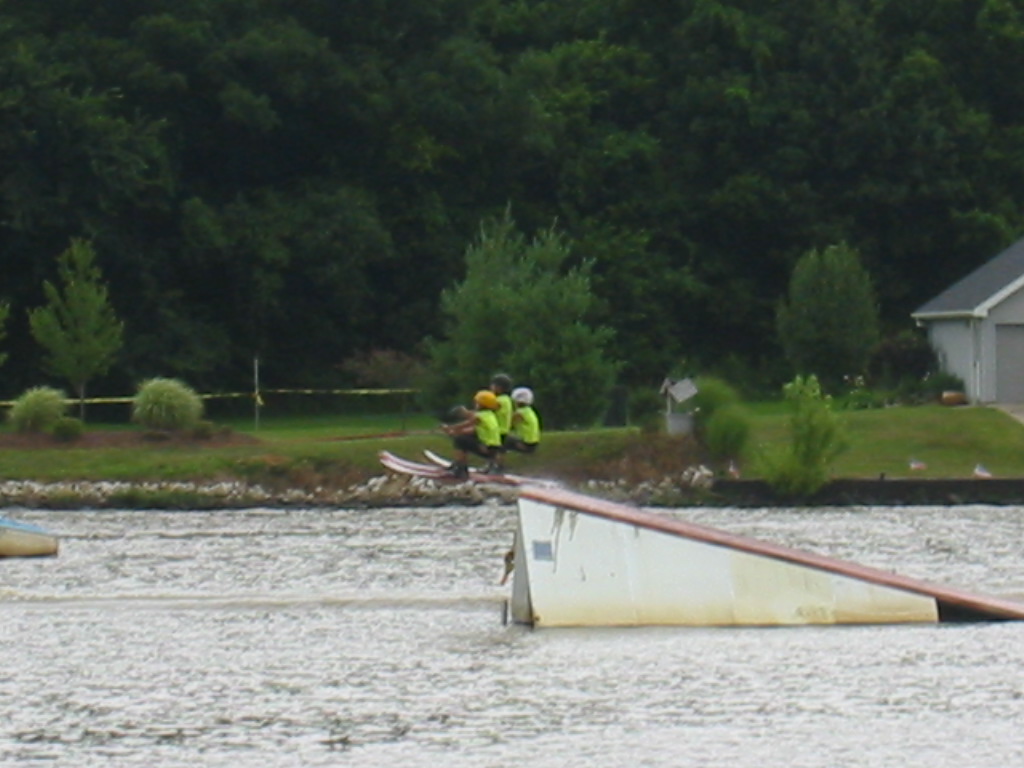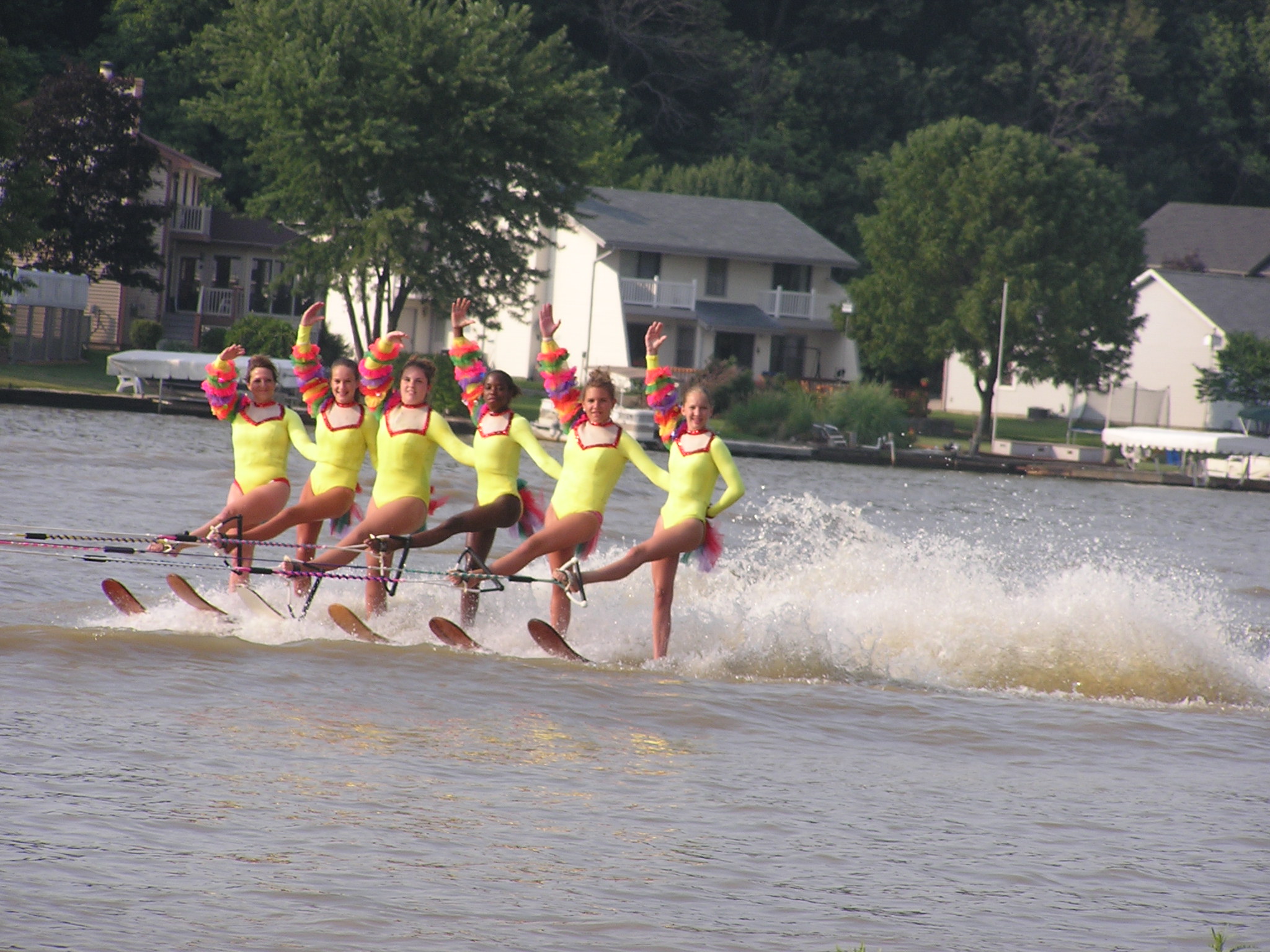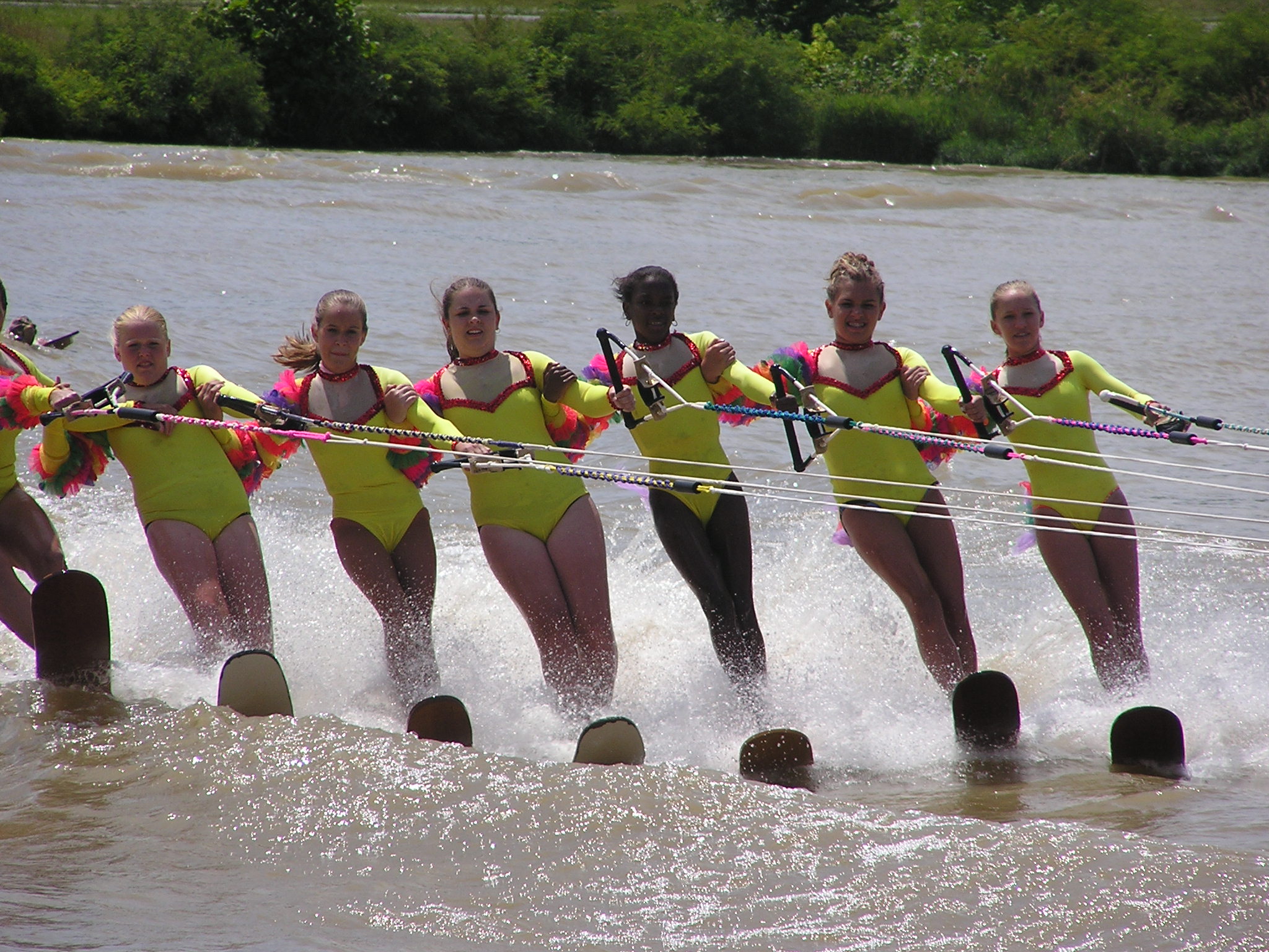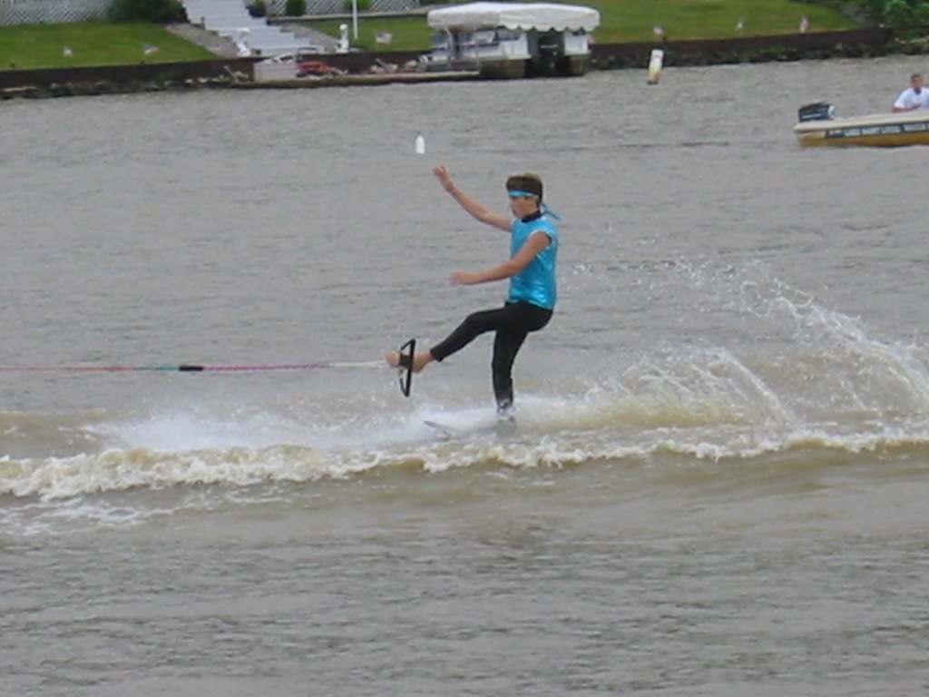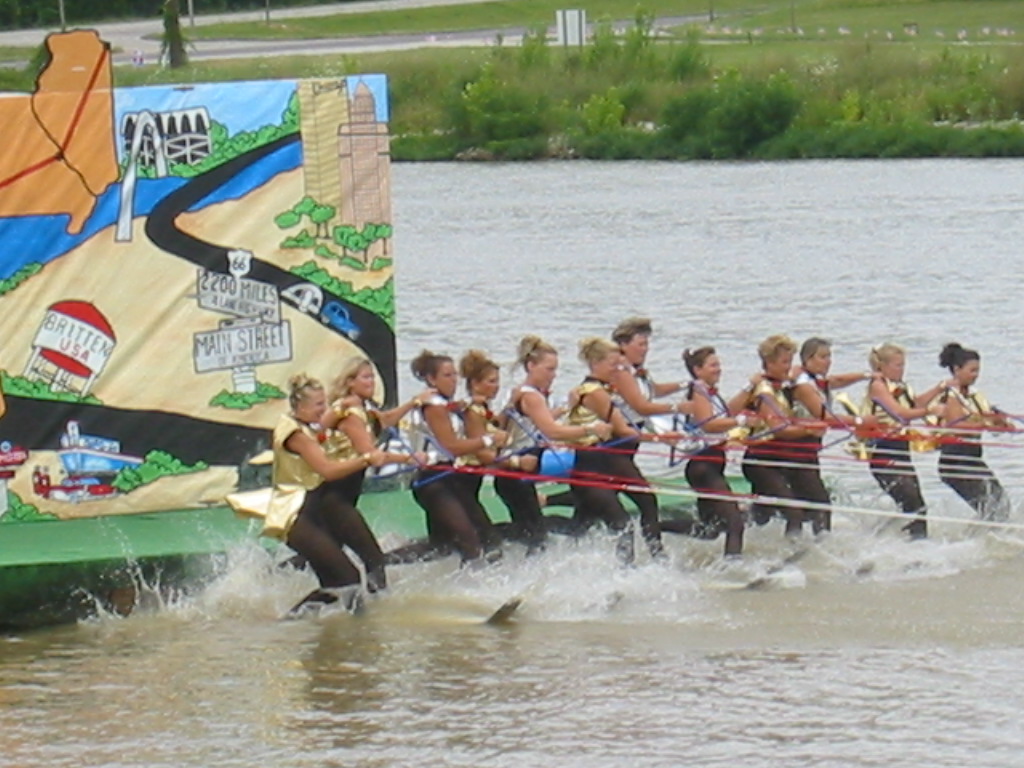 The entire show lasts over two hours and features everything from the very beginners to old codgers. There are wakeboarders, barefooters, ski jumpers, pyramids--the whole gamut. Come next year and see for yourself. There are some more pictures of LD and her line here , here , here , here , and here. They're all about 600 to 700 kb, so I hope you have a fast connection.