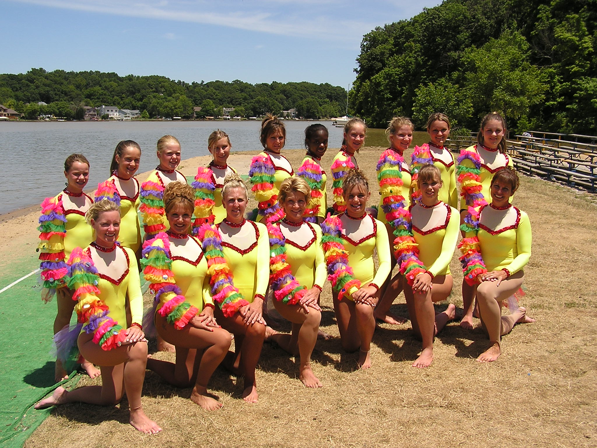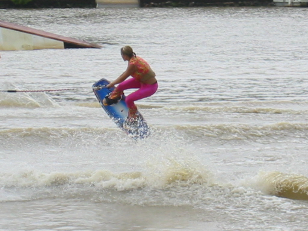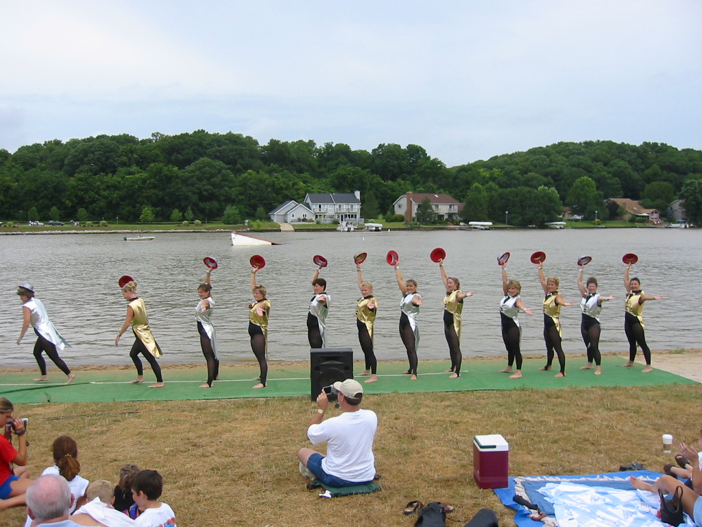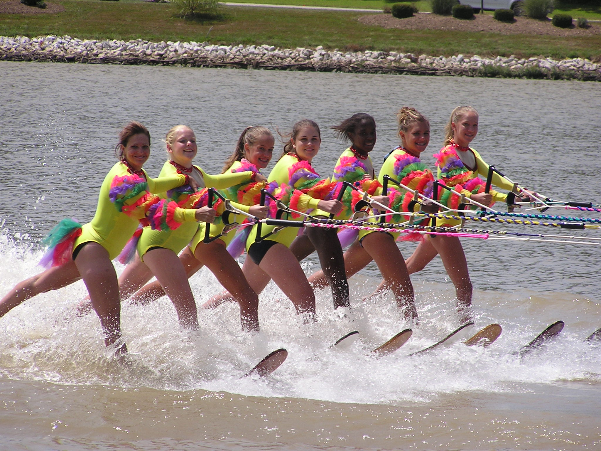 The entire show lasts over two hours and features everything from the very beginners to old codgers. There are wakeboarders, barefooters, ski jumpers, pyramids--the whole gamut. Come next year and see for yourself. There are some more pictures of LD and her line here , here , here , here , and here. They're all about 600 to 700 kb, so I hope you have a fast connection.