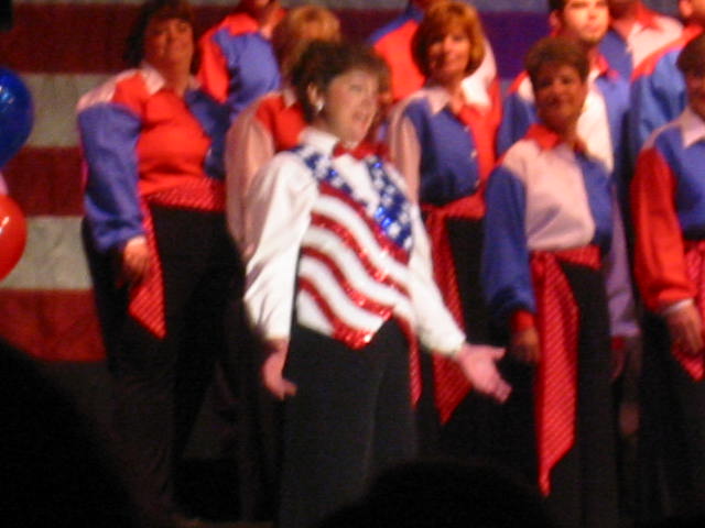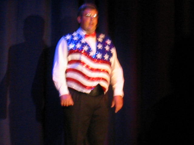 The rest of Saturday we just vegged. I cooked up some cheese brats on the grill (sorry, no pics) and we had potato salad, cole slaw and other fourth-of-July foods. We played some Texas Hold'em with the kids. You know what they say, a family that gambles together.... Sunday was the day. We got up early. I couldn't sleep due to pre-performance jitters. Kristie and I were in a show at church. We were the narrators. BoyHead took the pictures, which are a little shakey. Dig those flag vests though.