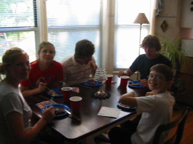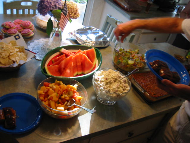 After we had a chance to recover from the festivities, it was time to prepare for la fiesta. We invited some good friends over for dinner. They have a boy and a girl the same ages as LW and BoyHead and we've known them since our early days here some eight years ago. He is a bon vivant, raconteur, and guitar player. So, we had ourselves a minor hootenany while I cooked up the pig tenders and the womenfolk traded recipes. On the menu was: Barbeque Pig tenders (boneless pork ribs), vegetable medley, baked beans (Bush's), potatoe salad, fruit salad and watermelon. The watermelon tasted like candy. We also had about 16 types of desert. But that's girl food.