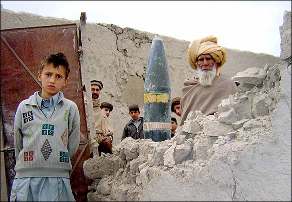 The only problem is that the long cylindrical item with a conical tip pictured with the boy and the man is not a missile at all. It is an old artillery shell. Not something that would have been fired from a Predator. Indeed, something that must have been found elsewhere and posed with the ruins and the little boy as a means at pulling of the heartstrings of the gullible readers of the New York Times.