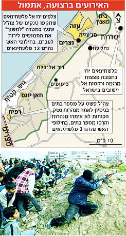 A Reuters photograph taken in Shijaia in the Gaza Strip published in the Hebrew edition of Haaretz today shows armed masked terrorists taking up firing positions surrounded by Palestinian boys and young men.